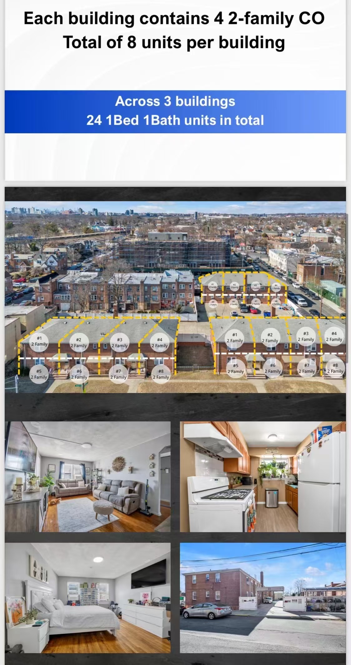 已经有多个投资者出offer, 赶紧约起来!独家代理:package sales 24套大一房大一厅(可以变成2房一厅),一共有12个2家庭的CO,好多玩法!还有一块地再盖4个2家庭。售价$428万,目前去掉开销净收入20万。详情联系代理经纪人李小姐347-885-8668 欢迎合作