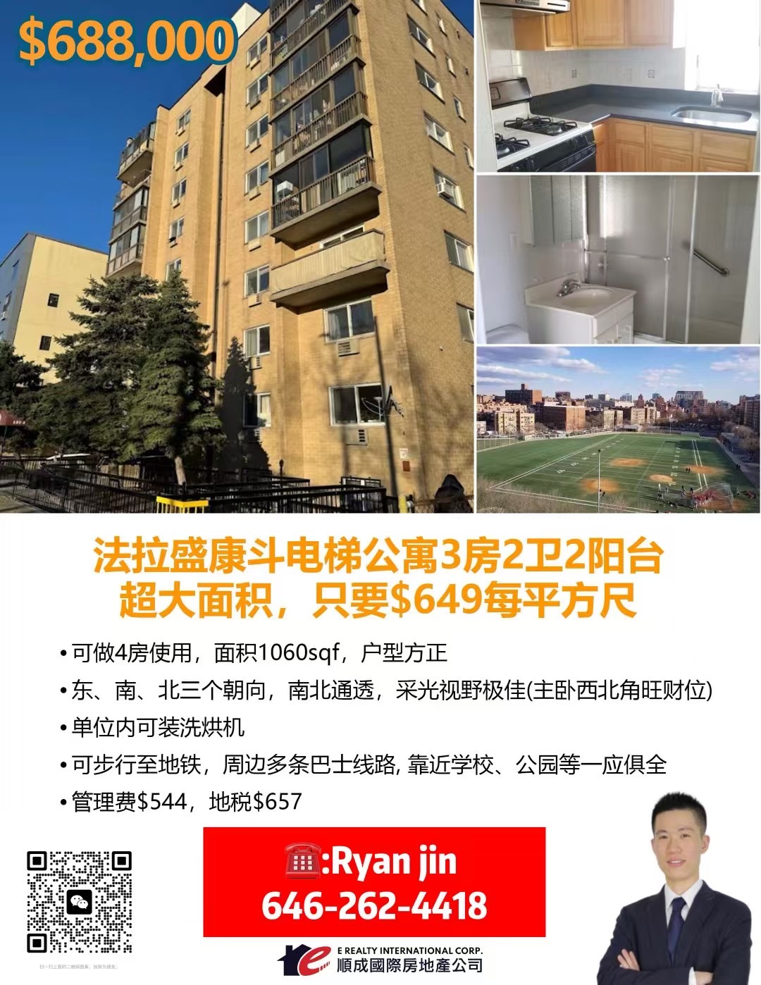 法拉盛康斗电梯公寓2房2卫2阳台,己改3房