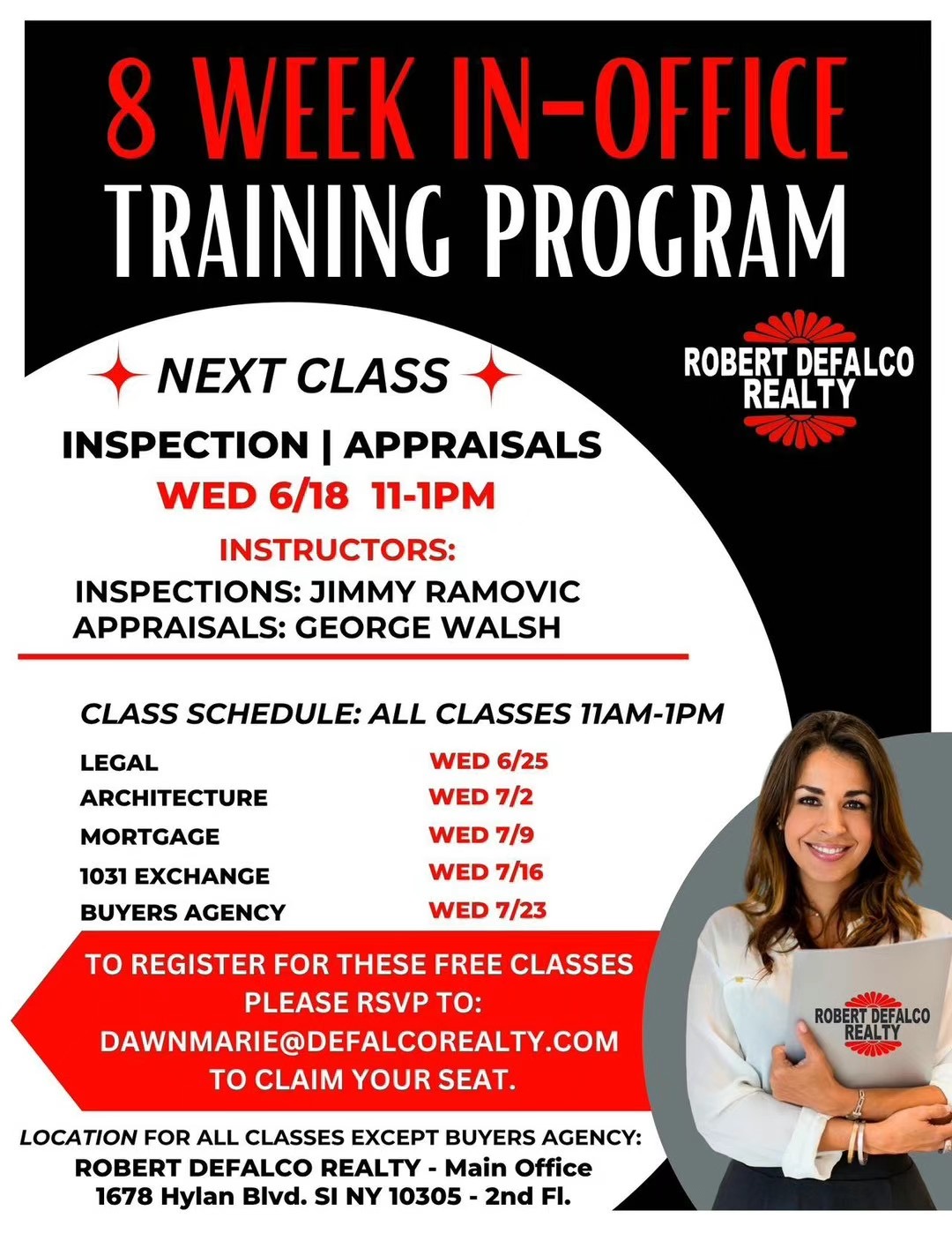 欢迎大家参加.8周培训课程 明天6月18日星期三,上午11点至下午1点将继续,内容包括评估与检查!ROBERT DEFALCO 8 WEEK TRAINING PROGRAM Continues TOMORROW WED 6/18 11-1PM with Appraisal and Inspection! live music and free prizes