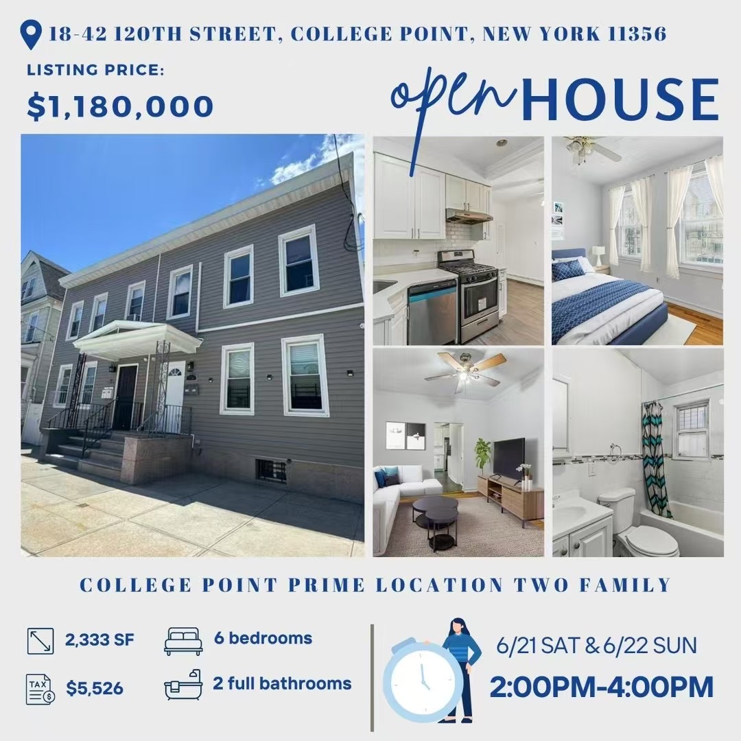 大学点2家庭房屋出售 安全地段 华人社区核心位置大学点双家庭出售 6卧室 • 2浴室大学点中心的罕见两户半独立式住宅。黄金地段的独特半独立式两户住宅。几分钟到达大学点中心、公园、学校和公共交通枢纽。房产特色:地块面积:23.33 x 100英尺(约6.1 x 3.7米)。分区:R4A,未来扩建潜力巨大。布局:两层楼+带独立入口的精装修地下室。一楼:3间卧室,1间浴室,空。二楼:3间卧室,1间浴室,出租。地下室:独立入口,宽敞的开放空间,配备设施齐全的浴室。低房产税:每年仅需5,526美元,低维护成本!地理位置优越:距离商店、餐厅、公园、银行和学校仅几步之遥。多条公交线路(Q65、Q25、Q20A)直达法拉盛中心,适合:寻求舒适主要住宅并附带出租单元以抵消抵押贷款的买家。高租金收入、优越地理位置,长期增值潜力!不要错过这个在皇后区最令人向往的社区之一拥有一套坚固、可创收的房屋的绝佳机会!学院点中心的稀有双拼两户住宅