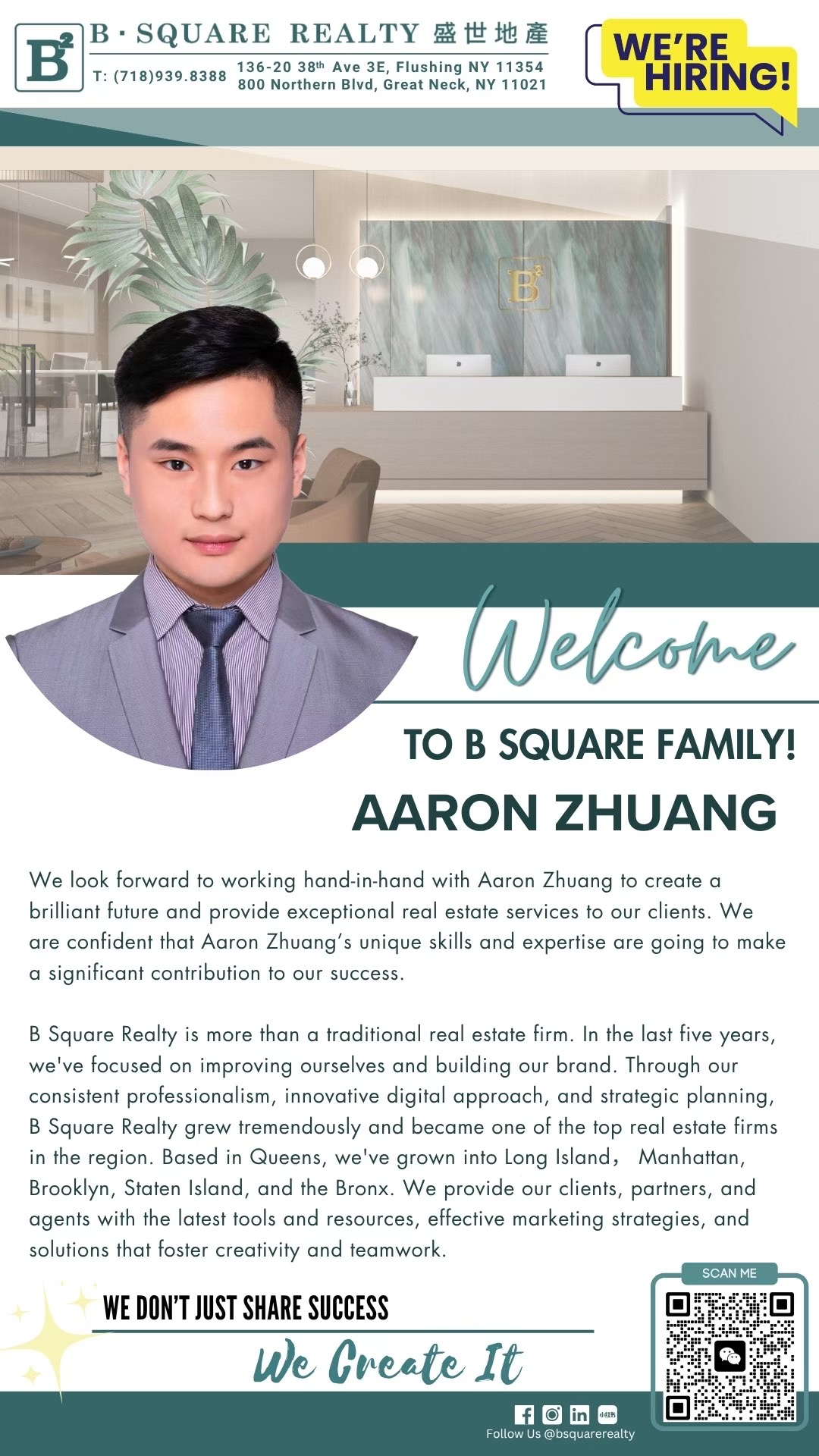 Queens 和 Brooklyn 华人房产经纪人推荐 精通住宅买卖与投资项目管理 布鲁克林华人房地产团队推荐专业带看 高效成交 纽约买房无忧首选布鲁克林华人房地产团队推荐专业带看 高效成交 纽约买房无忧首选欢迎Aaron Zhuang加入B Square Realty,开启他的房地产事业新篇章。与盛世精英,共同创造非凡未来。B Square Realty,一个不断创新、专注成长的房地产领航者,覆盖纽约多个区域,提供前沿的工具和资源,助您成就业务卓越。