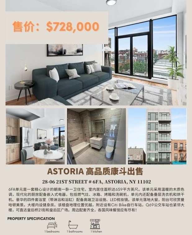 🔥皇后区更有升值潜力的Astoria 2024年现代康斗一房一厅一卫出售💰售价$728,000。付款灵活!接受RMB。■面积 659 尺 ,全屋落地窗,采光极好,大阳台可以看曼哈顿景色。