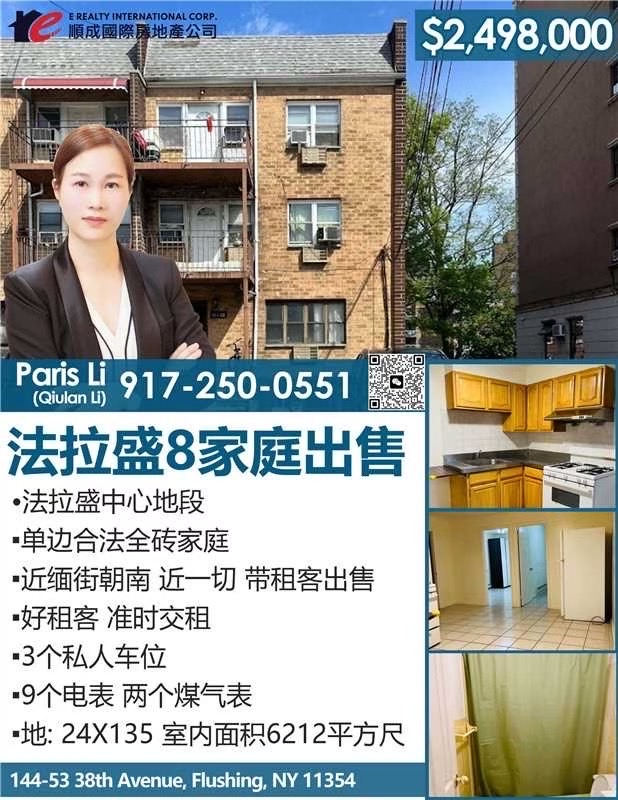 🎈独家代理法拉盛黄金地段🎈🎈单边8家庭出售投资自住首选 高回报率近缅街朝南 近一切3个私人车位9个电表 两个煤气表室内面积6212平方尺售价:$2,495,000