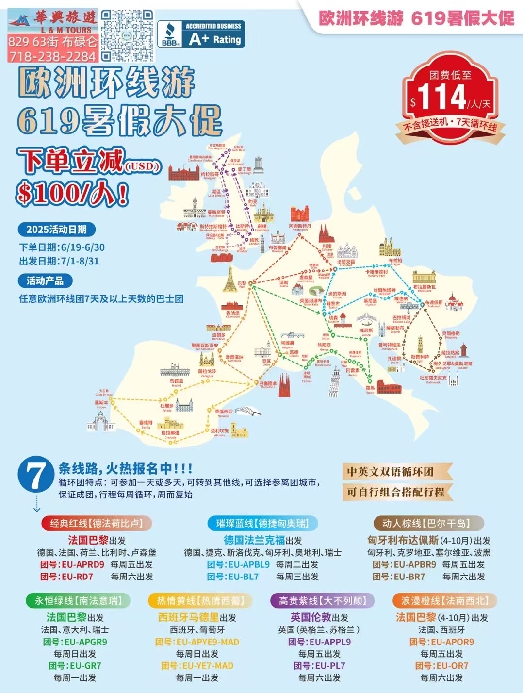 💰619暑期大促活动期间凡报名任意欧洲环线团7天及以上天数巴士团或组合团,下单立减$100/人,参团越多,优惠越多!