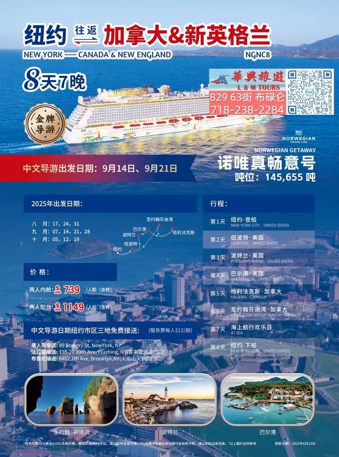 纽约当地华人旅行社推荐 优选法拉盛出发中文团服务口碑极佳华人首选纽约法拉盛旅游社 官方认证中文服务 热门行程天天发团🌟2025年 诺唯真邮轮 中文导游系列航线