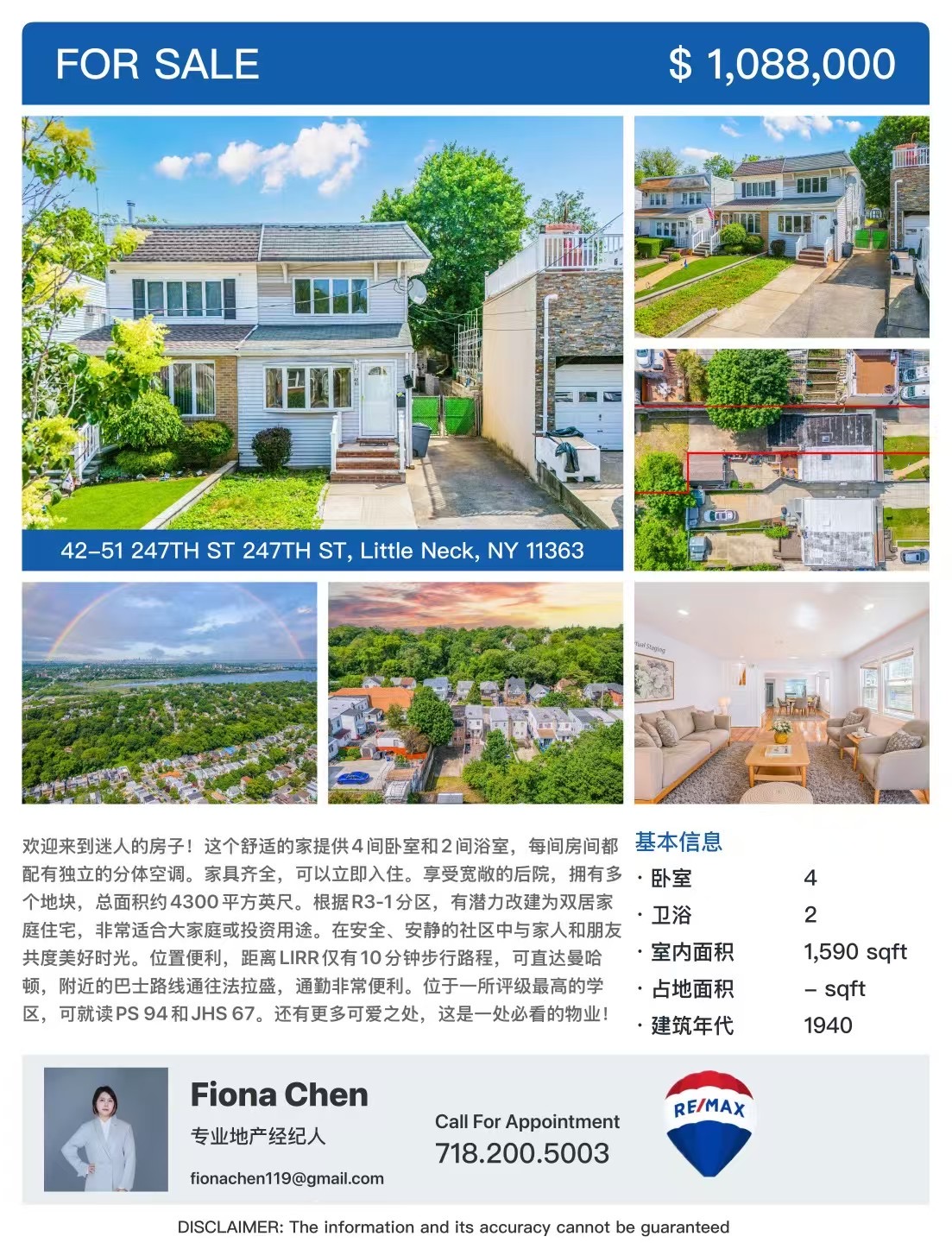 Little Neck 新上市单边一家庭住宅,4房2浴,适合三代同堂, 领包即可入住.