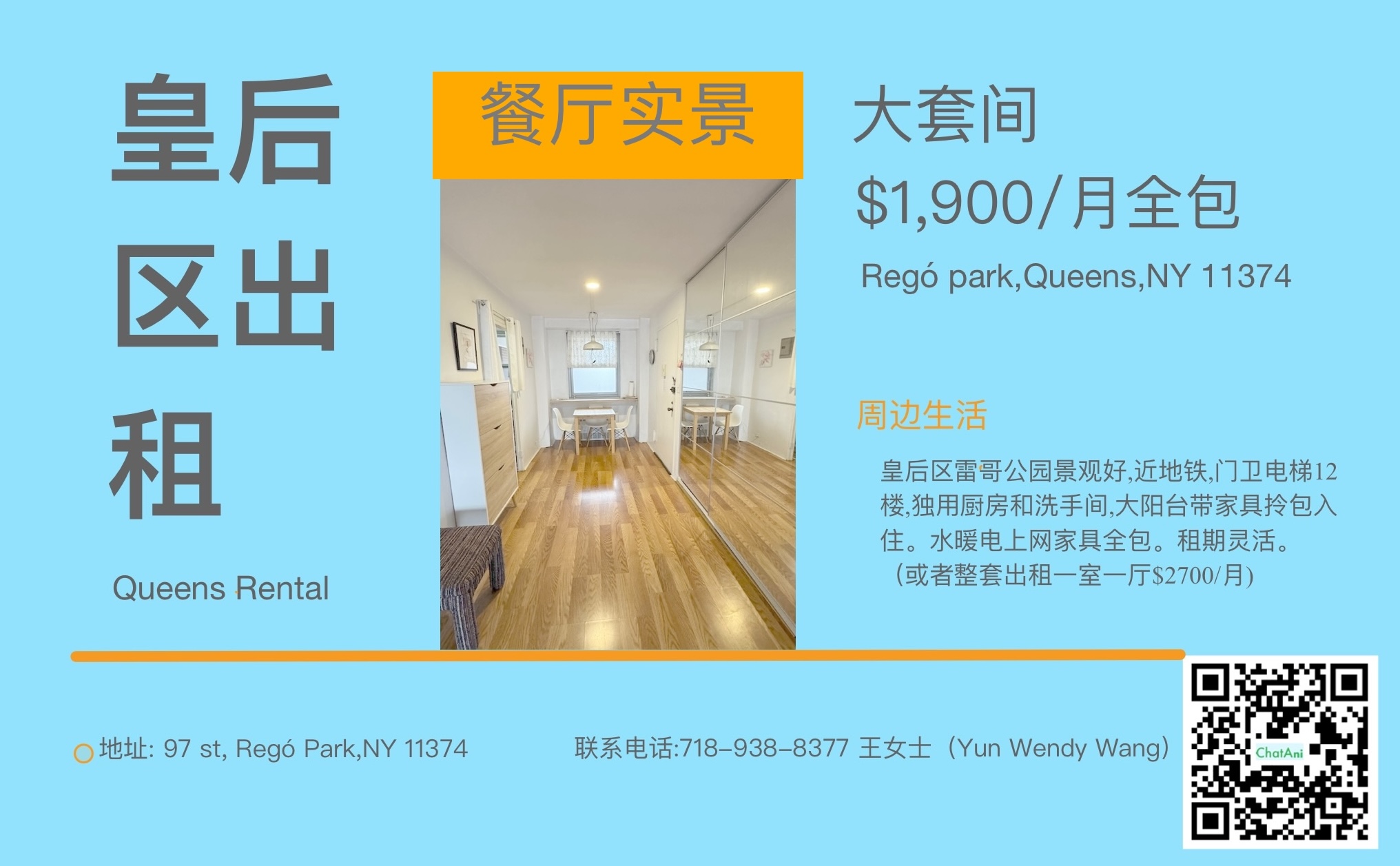 纽约皇后区雷哥公园景观好,近地铁,门卫电梯12楼,独用厨房和洗手间,大阳台带家具拎包入住。水暖电上网家具全包$1900/月。租期灵活。(或者整套一室一厅$2700/月)