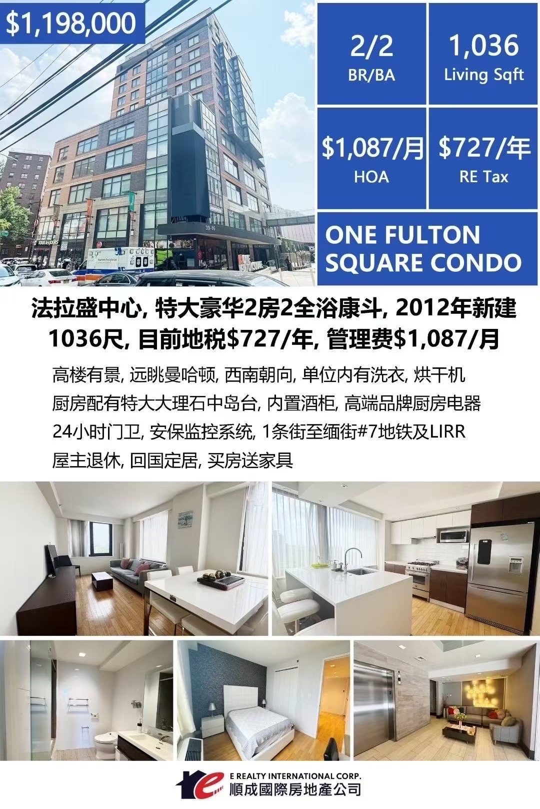 🎉新上市 法拉盛顺成独家代理🎉 2卧2全浴 $1,198,000 ✨法拉盛黄金地段,年轻condo,领包入住,兼具都市奢华与无可比拟的便利性。宽敞的2卧室2浴室公寓,室内采光充足,客厅宽敞明亮,可尽览城市美景,搭配全屋优雅木地板。开放式厨房配备通风系统、不锈钢电器与花岗岩台面,是热爱烹饪者的理想选择。主卧面积宽敞,带有独立卫浴,次卧设有大衣柜,起居区另有额外储物空间,方便整洁收纳。其他亮点包括室内洗衣机/烘干机、酒櫃,24小时门卫与监控系统,步行可达7号地铁、LIRR火车站、凯悦酒店、Tangram商场、各类商店与餐厅,地理位置优越。集舒适与价值于一体,是皇后区最受欢迎地段之一的理想居所。