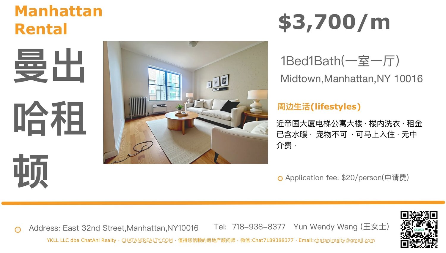 纽约最中心地段,近帝国大厦电梯公寓大楼 · 楼内洗衣 · 易合租 · 租金已含水暖 · 宠物不可 · 可马上入住 · 无中介费 ·