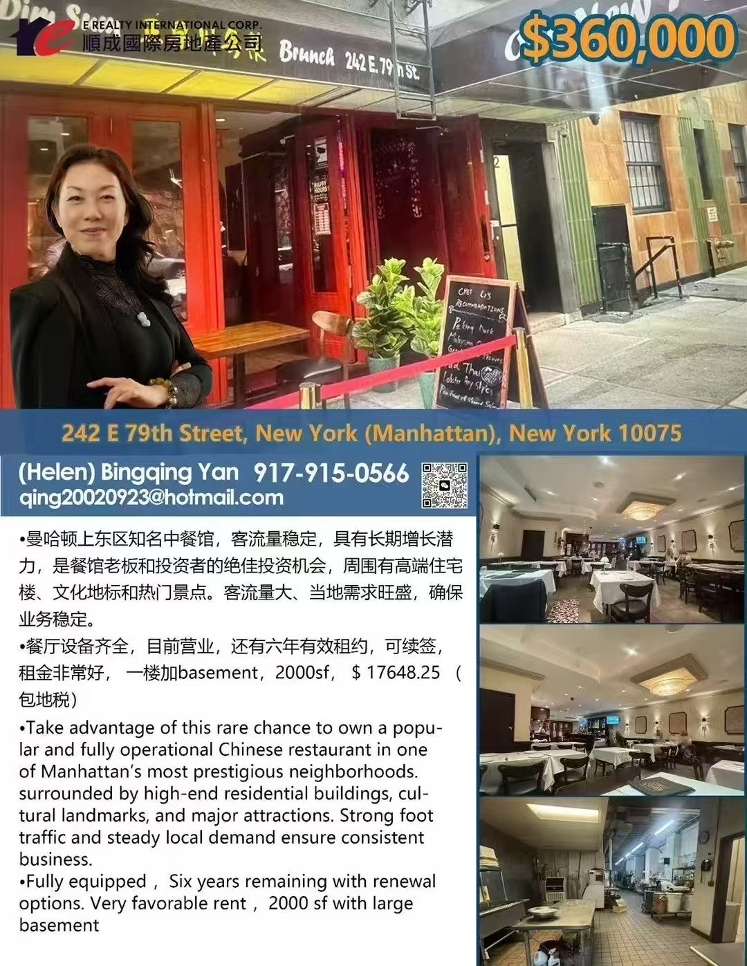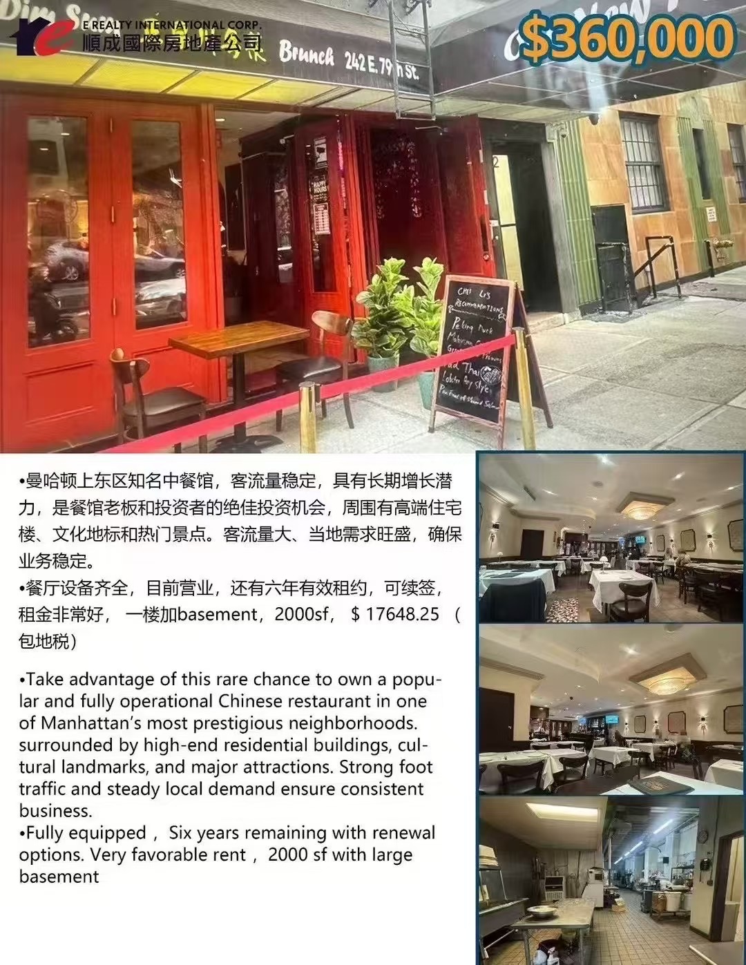 ❤️抓住机会,在曼哈顿最受追捧的社区之一——上东区知名中餐馆,可靠人流量流和长期增长潜力,餐馆老板或投资者是一个绝佳的投资机会。