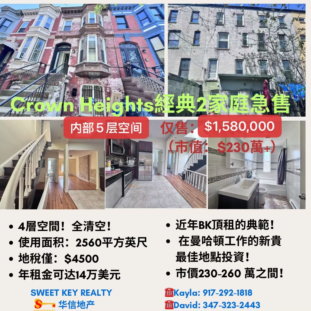 🎈🎈明天下午开看,布鲁克林房屋买卖Brooklyn NY新上市布碌仑房屋住宅出售欢迎所有人华信地产独家,欢迎合作!近年Bk顶租的典范!Crown Heights !经典2家庭,可贷款!屋主急售!💰急降至:$158万,随时约看!👉市值2百多万💎内部5层空间!2560 尺使用空间!💎地税仅:$4500!💎全清空!可收租14万!💎低于市价50万!在曼哈顿工作的新贵最佳地点投资!自住+收高租两不相误!仅需细微装修整理!917-292-1818