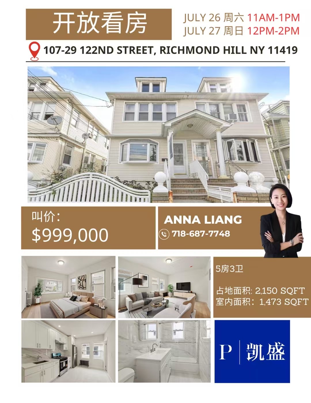 皇后区房子出售新装修皇后区单边2家庭$ 999,000完成地下室独立进出一楼2房1卫二楼2房1厅有车库,更多详细☎️718-687-7748 Anna梁☎️917-749-7921 Stephen陈