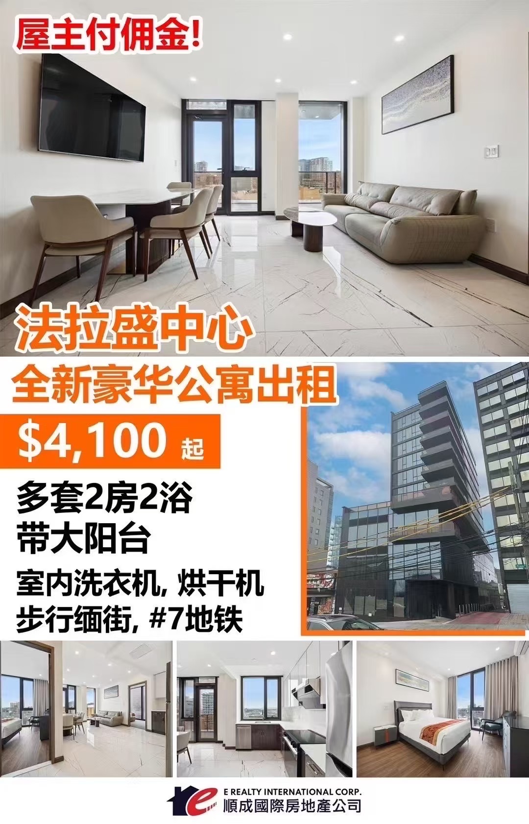法拉盛中心地铁口附近全新高端出租康斗!室内洗烘 ,两房两浴(包家具)。 自己有家俱也 ok 随时入住!-流地段全新公寓2128109985