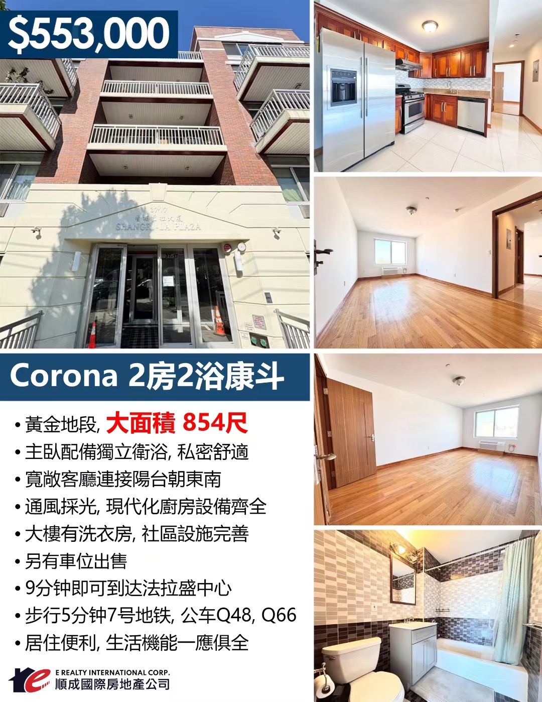 🎈週日工展12~2PM🎈👏🏻9分钟到达 法拉盛中心、Skyview 購物中心🛍️、Tangram電影院🎬。新上市✨超大 兩房兩卫 condo出售 $55万3(面積854尺)有陽台 ✨朝東南。