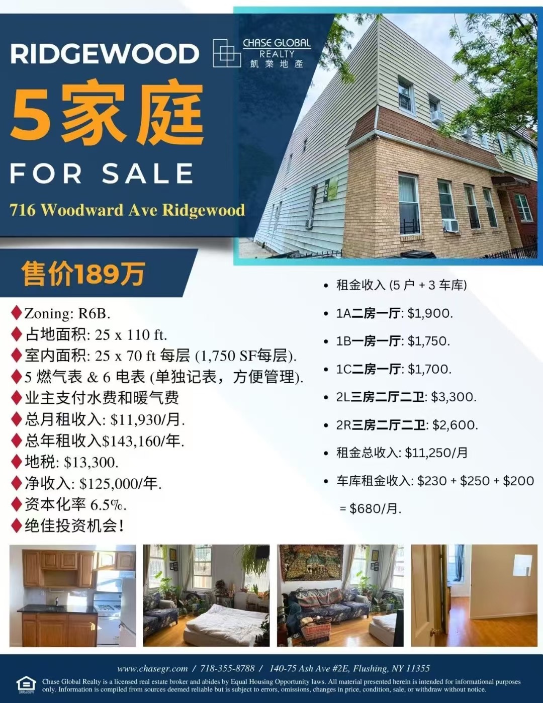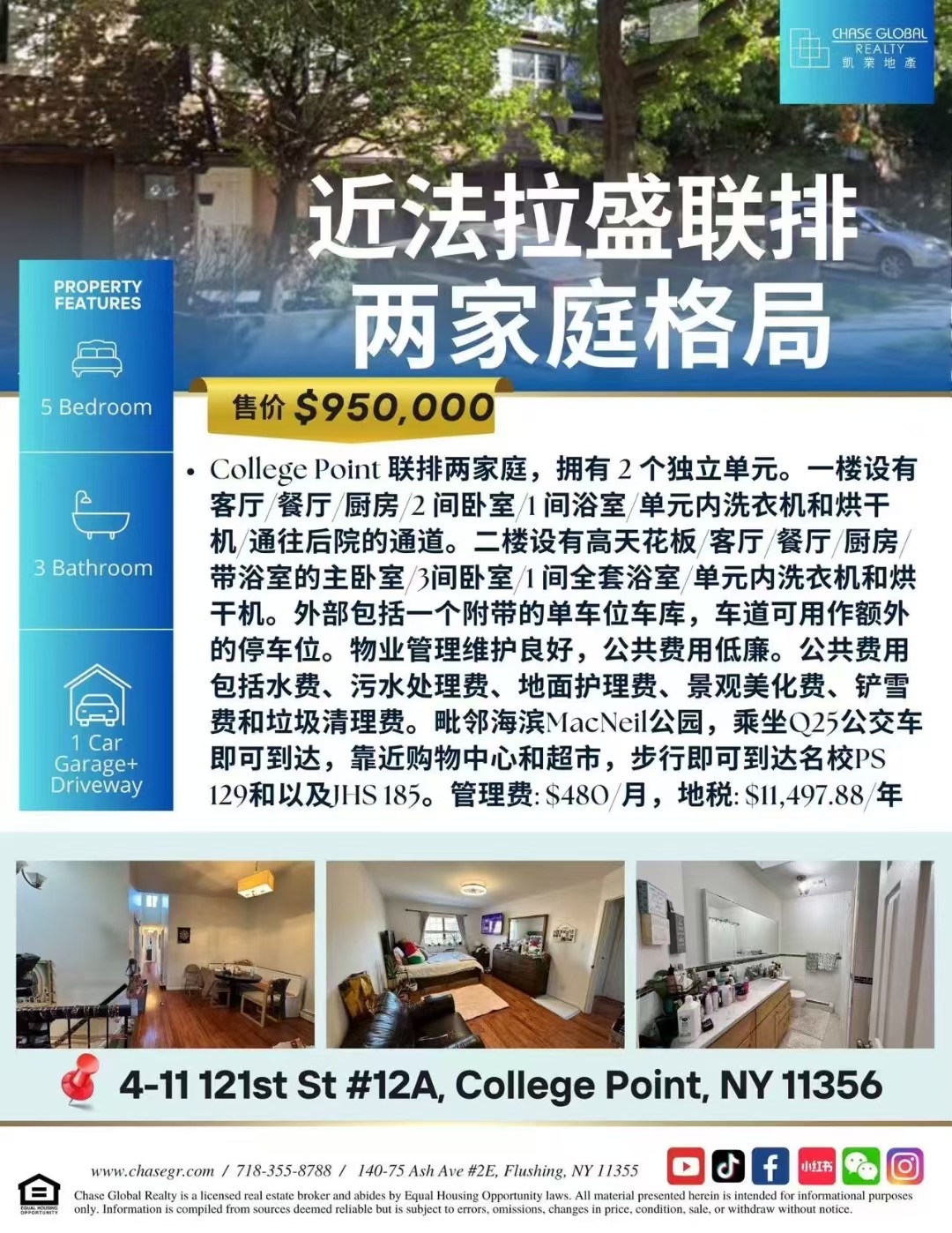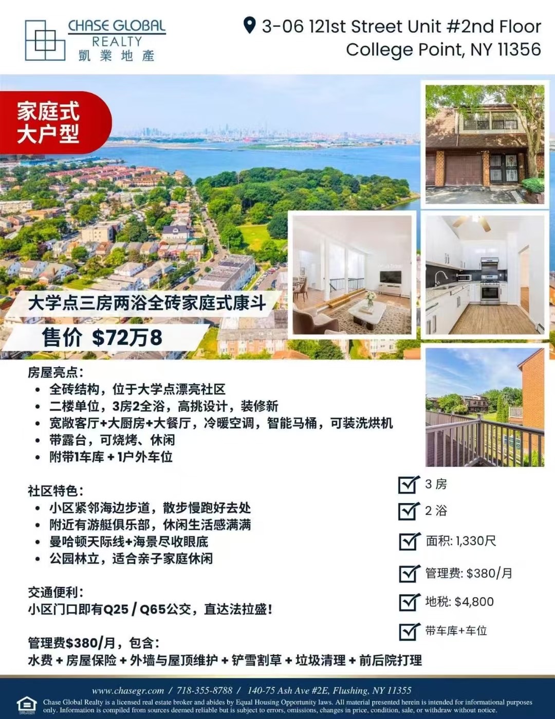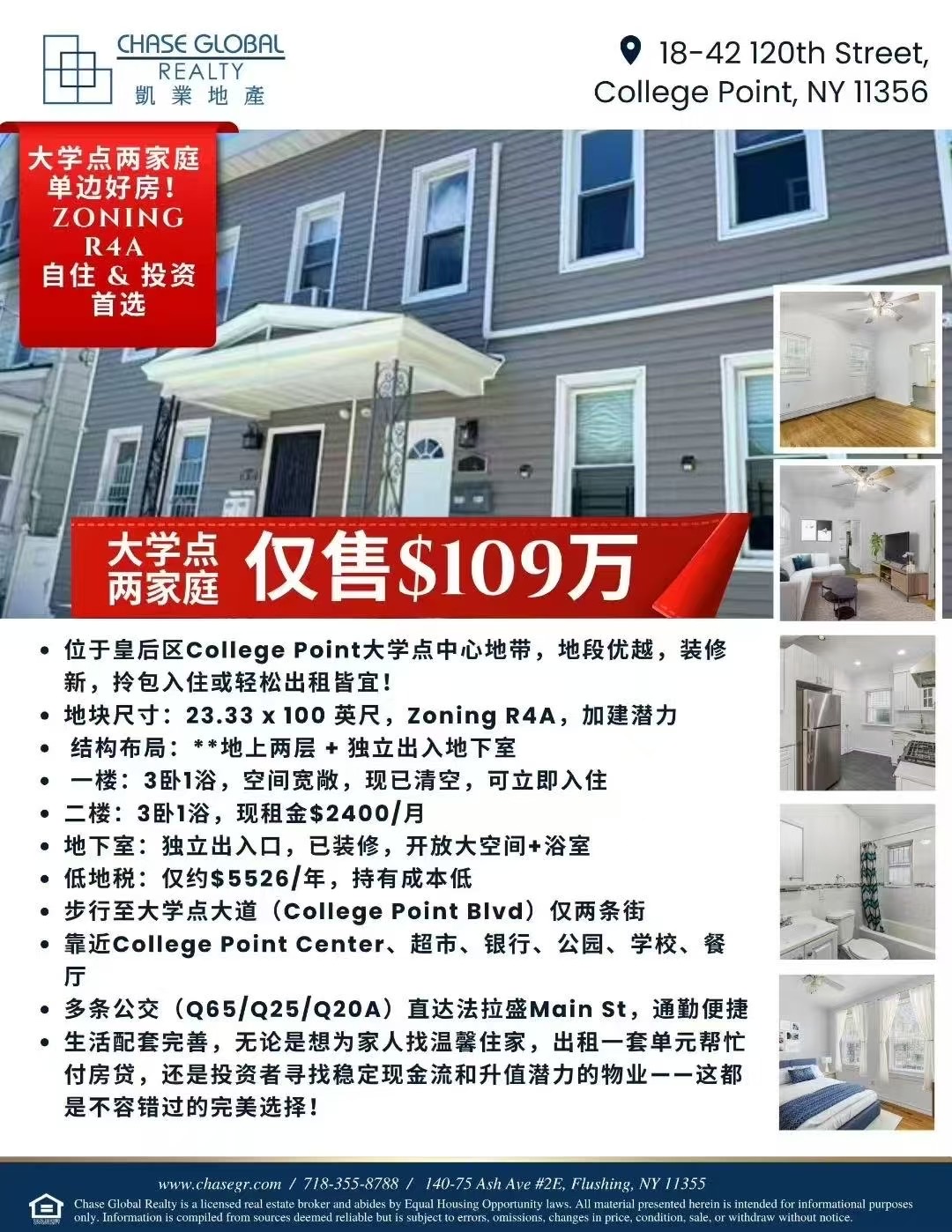Queens一家庭出售 稀缺挂牌 带花园+阳台皇后区一家庭出售 靠近超市学校 华人区热盘 皇后区合法两家庭出售 可贷款 可自住 华人热区皇后区两家庭房源出售 结构新翻修 带后院停车位皇后区中心康斗出售 临近商场地铁 出行购物方便Queens优质康斗出售 房屋状况新 产权清晰 可贷款 我们公司独家代理代理,房源多多,住家,商业,投資,自住总有一款适合您💐