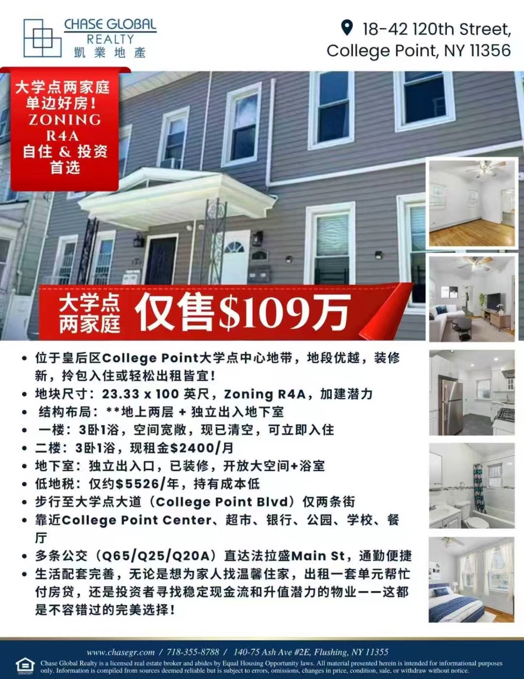 位于皇后区College Point大学点中心地带,地段优越,装修新,拎包入住或轻松出租皆宜!