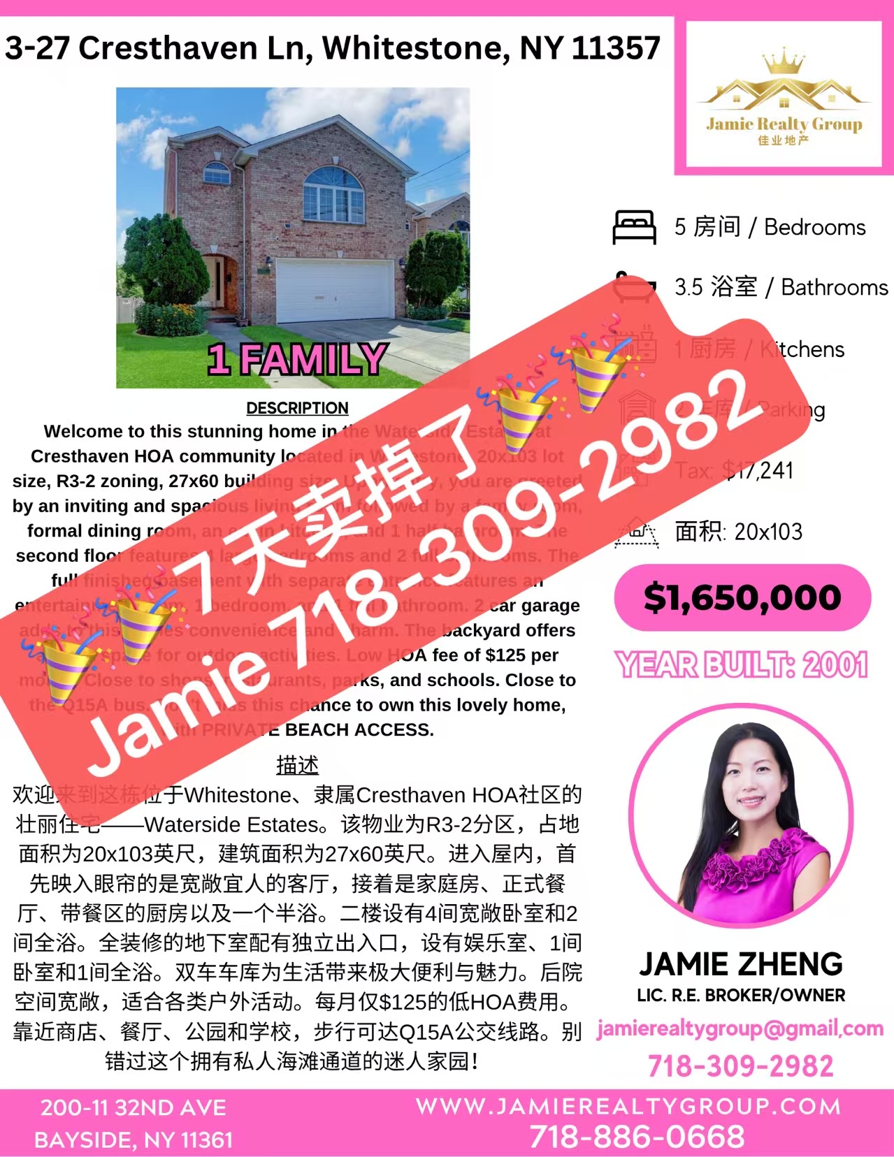纽约地产经纪人在市场才7天又卖了合同已签白石镇豪宅恭喜卖家,拿到非常好的价钱欢迎委托佳业地产