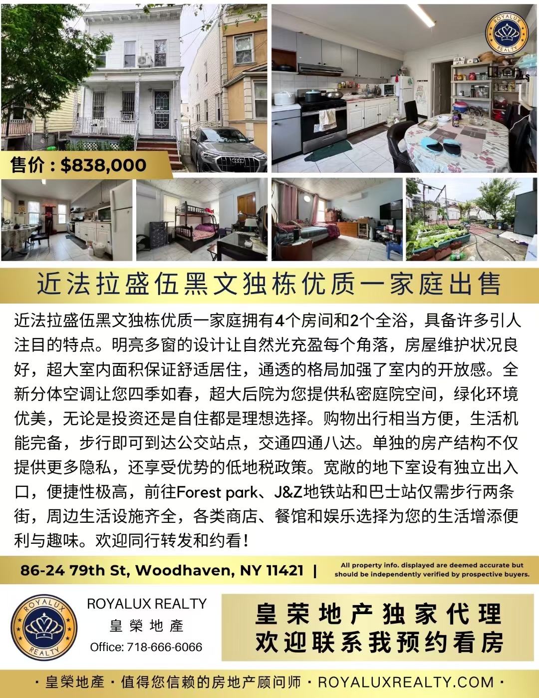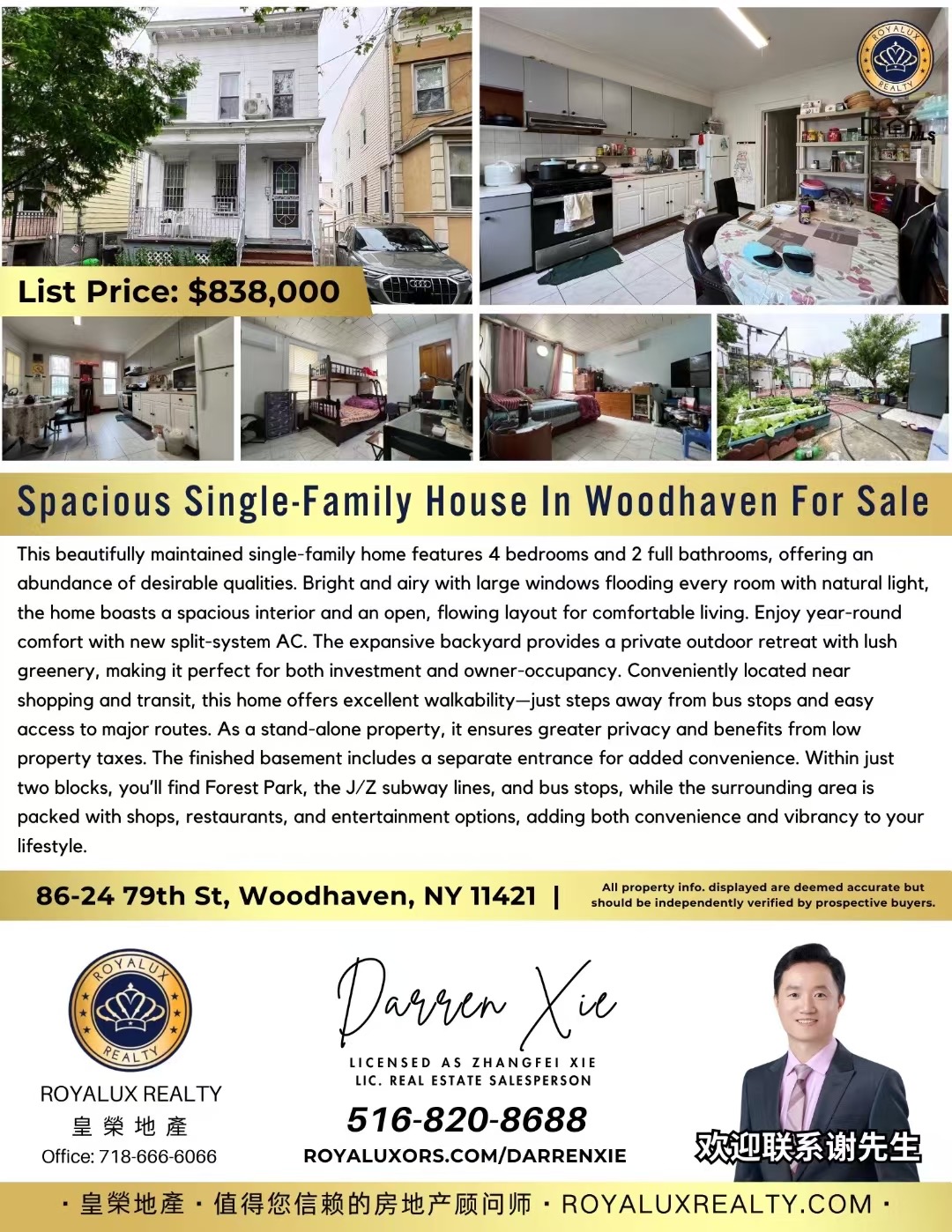 📍地址:86-24 79th St, Woodhaven, NY 11421 📲约看联系负责经纪:Darren 516-820-8688