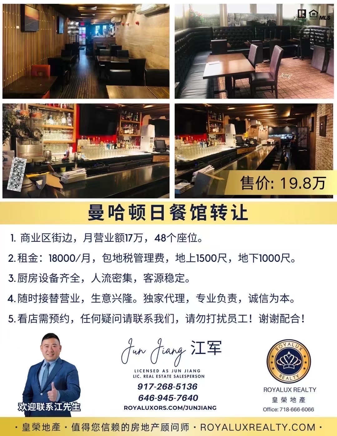 🥇曼哈顿、长岛各类餐馆🍲转让🗽纽约房屋买卖找江軍☎️9172685136用良知做事成就幸福人生 法拉盛商铺出售生意转让 双重收益 投资自用两不误 法拉盛店面出租含生意转让 美容美发奶茶餐饮店整转旺铺推荐