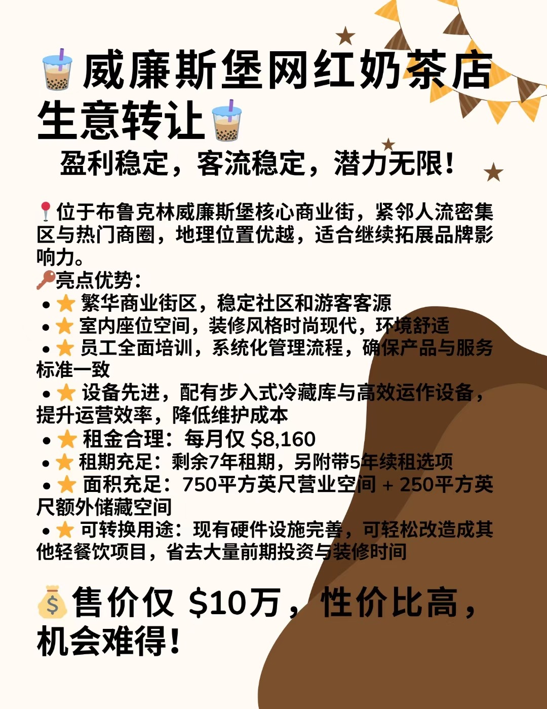 🧋威廉斯堡网红奶茶店生意转让🧋盈利稳定,客流稳定,潜力无限!📍位于布鲁克林威廉斯堡核心商业街,紧邻人流密集区与热门商圈,地理位置优越,适合继续拓展品牌影响力。