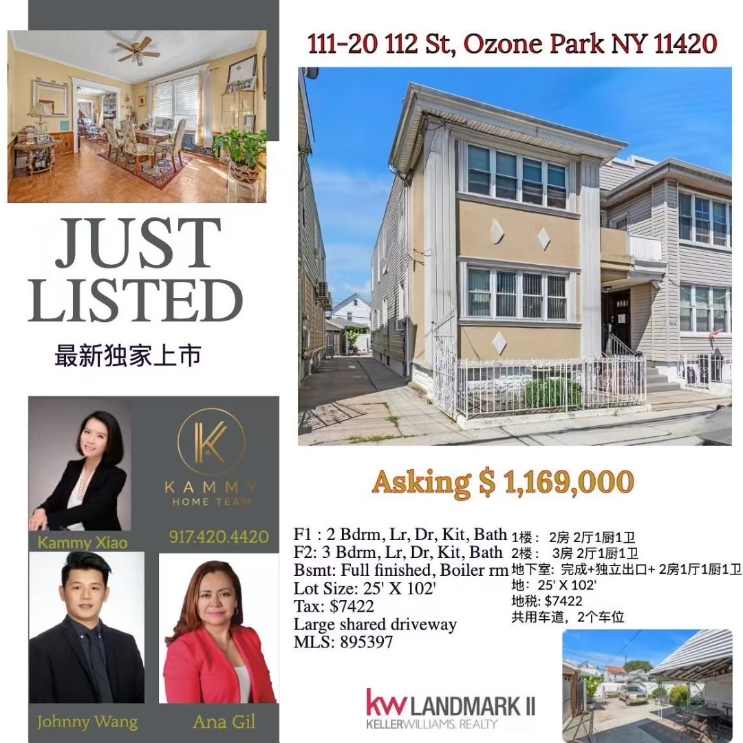 皇后区房子出售🔥最新独家上市🔥一流自住加投资房❤️111-20 112 St Ozone Park NY 11420. 建筑面积20×55、 地25x102, 特大共用车道,两个车位、 完成前后门出口地下室,步行几条街到A车111街站、门口就是各种的公交车、一流地点,拎包入住,马上收租👌只叫价$1,169,000. 手慢无! 本周曰1-3点公展. 详情请微信联系肖小姐9174204420