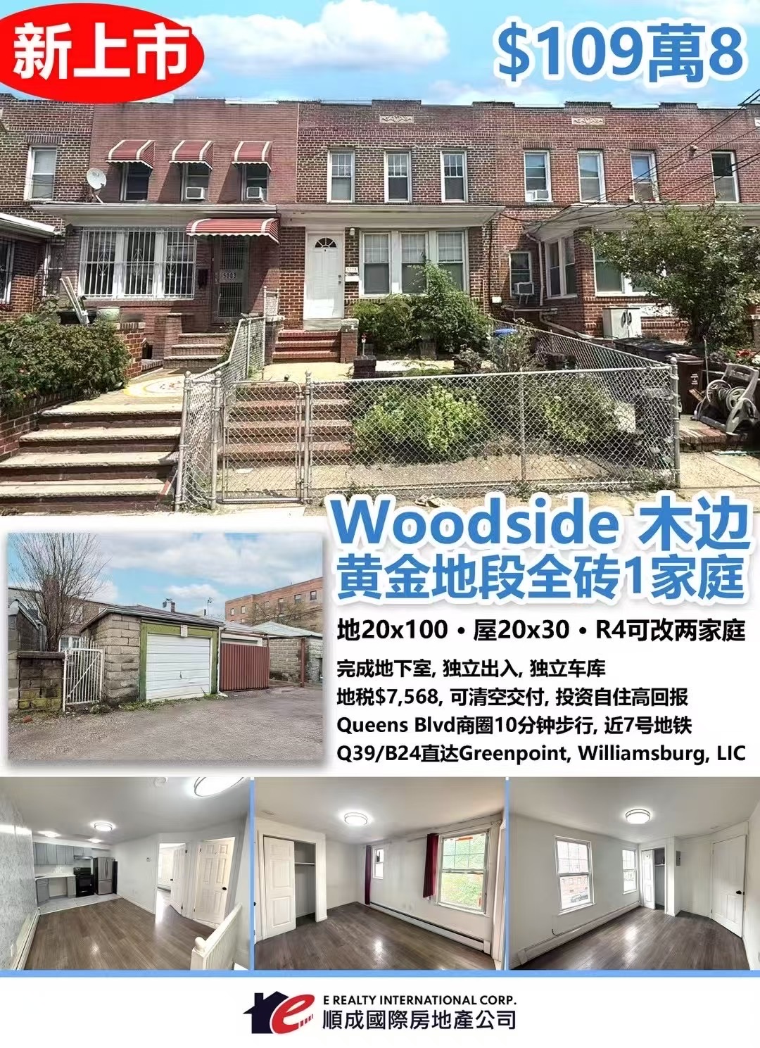 皇后区房子出售新上市顺成独家代理收租王连幢一家拎包入住适合大家庭一起住50-05 46st Woodside 木边全砖1家庭位于黄金地段,步行十分钟到Queens blvd商业区和七号地铁. 附近有Q39/B24巴士可抵达green point, south williamsburg, 和LIC。近495与278高速,地20x100,屋20x30,R4可改合法2家庭,完全地下室,独立分门出入,独立车库,地税$7568,可清空,适合投资自住,高回报,售$109万8,欢迎同行转发合作,E Realty International Corp电顺成经纪Shirley 楊雪莉 646-688-8998 Jenny He:7185527663
