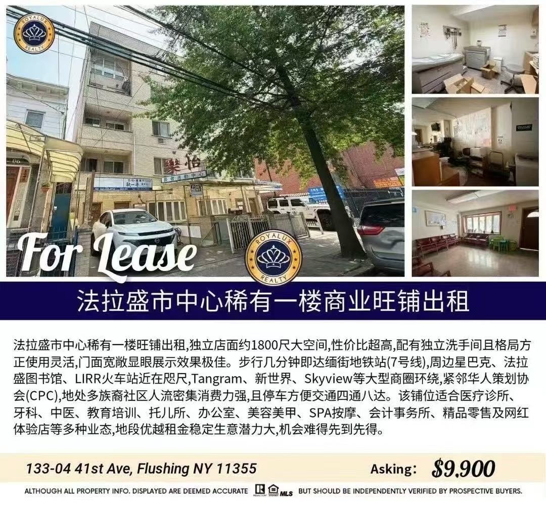 🔥法拉盛市中心一楼旺铺出租🔥⚠️屋主付佣金,欢迎合作!📍133-04 41st Ave, Flushing📐约1800尺,门面宽敞,格局方正💰月租仅 $9,900‼️🚻 独立洗手间,可多种用途🚇 步行到缅街地铁站,地段超好🏬 周边大型商圈环绕,人流旺✅ 医疗、美容、教育、办公都适合☎️Vicky苏 347-667-9688