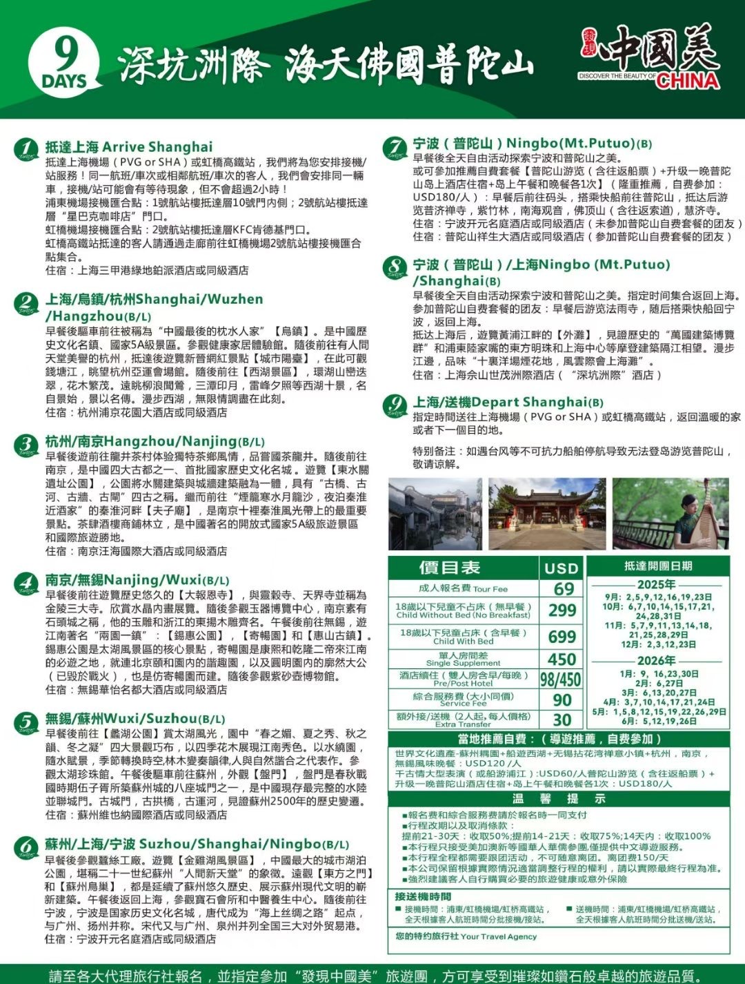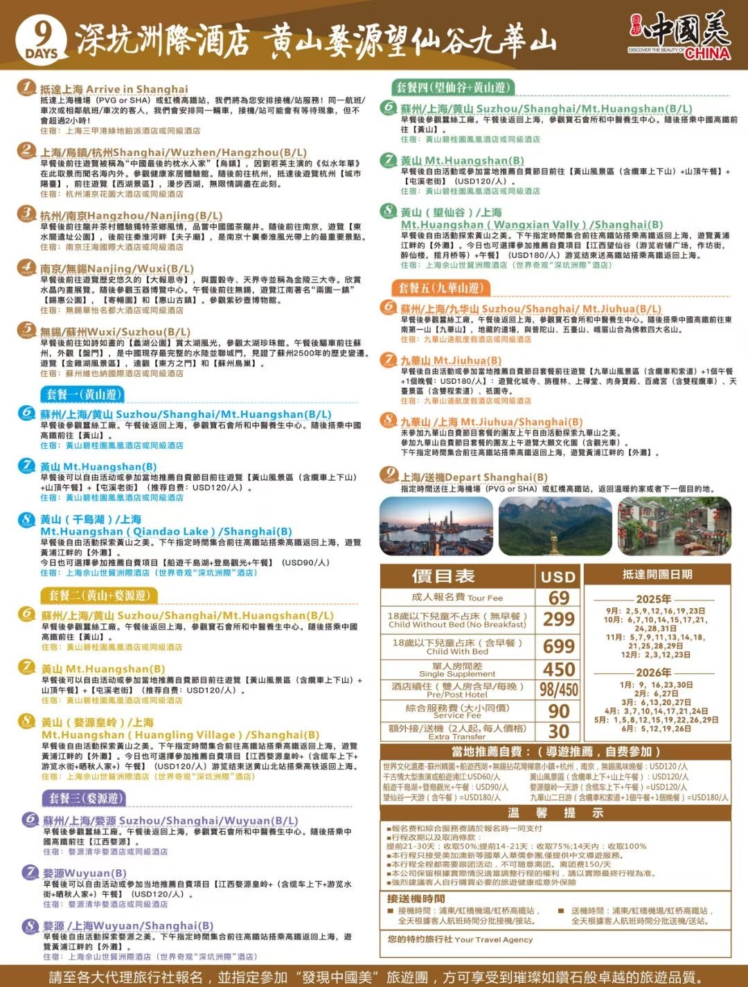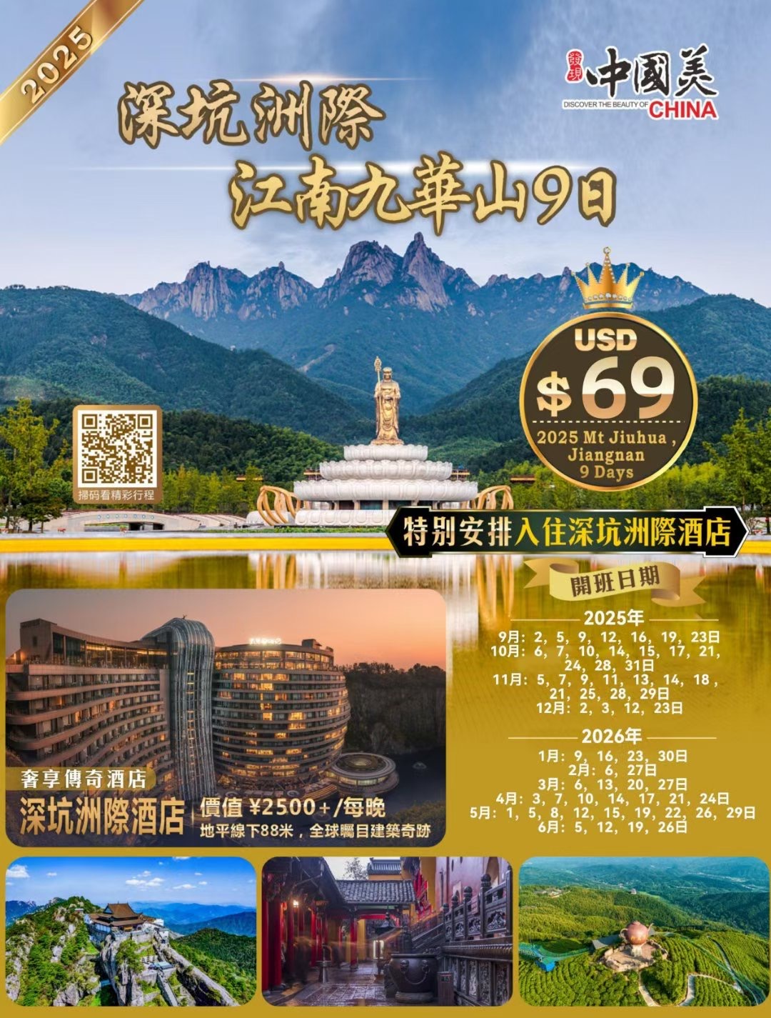 中国美江南线路秋季炸裂!新增海量开班日期轰炸上市!💥💥中国美江南2026年日期领先上市!💥💥市场顶配品质,开班日期王炸!惊爆价$0起秒杀全宇宙‼️ 横扫江南顶奢套餐,打卡顶流仙境!铂金江南:五大名城联动,人生大满足!安徽黄山:登顶奇松云海之巅!☁️宁波普陀山:海天佛国,画中朝圣!🚤 江西婺源:篁岭醉美晒秋,一眼万年!🌾 江西望仙谷:悬崖仙侠,直通秘境!🏞 安徽九华山:佛国圣境,心莲盛放!🪷 [👑 殿堂级独霸]:传奇InterContinental深坑洲际!🏨 壕占¥2500+/晚 | 魔幻地心88米!全球建筑奇迹霸屏朋友圈!🌍✨🔥 手慢无!提前锁定2026王炸席位