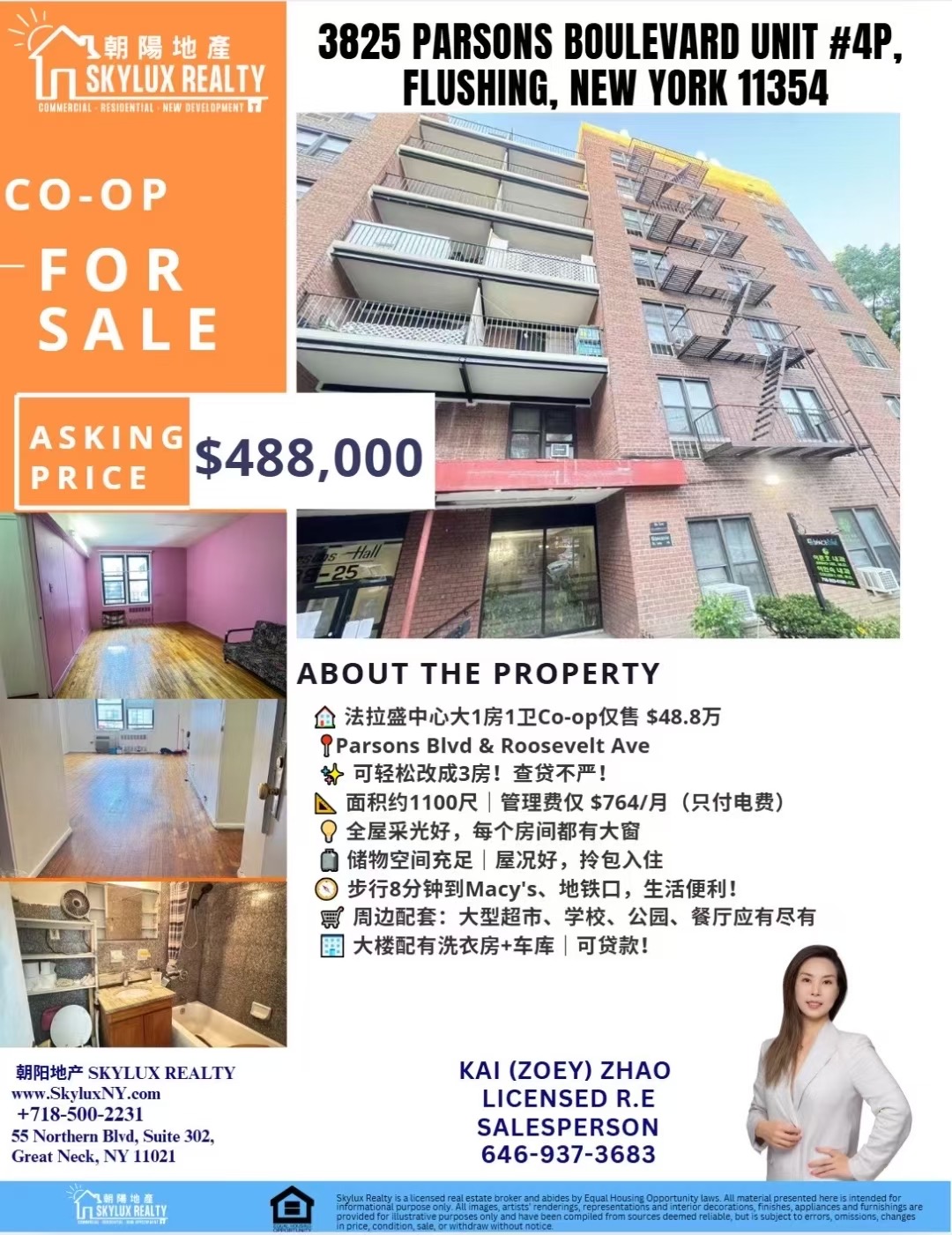 🆕法拉盛新上市 周末公展🎈🎈有钥匙🔑随时看 需预约法拉盛中心超大1房1卫查不严Coop出售$48.8万(轻松做3房)面积1000左右 ;管理费764只付电费🉑马上出租 🉑买给父母住🉑宠物每个房间都有大窗,储物空间多交通便利,走路8房子房子到Macy's 地铁口生活设施齐全:附近有大超市,学校,公园,餐厅等大楼有洗衣房,车库,可贷款!欢迎合作转发 有视频欢迎索取电话☎️6469373683 赵小姐
