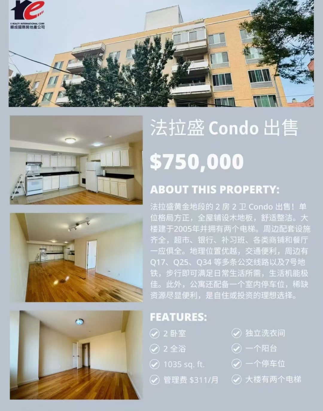 🎉1035 sqft Condo 法拉盛康斗出售两房两卫 $750,000- 管理费$311 包水- 大楼配备两部电梯- 独立洗衣间,开阔的阳台- 近超市, 银行, 商铺及餐厅- 附带一个室内停车位🌟- 近Kissena Blvd,交通方便- 步行即可到达Q17、Q25、Q27、Q34等多条巴士线路及7号地铁站欢迎买家6465089880
