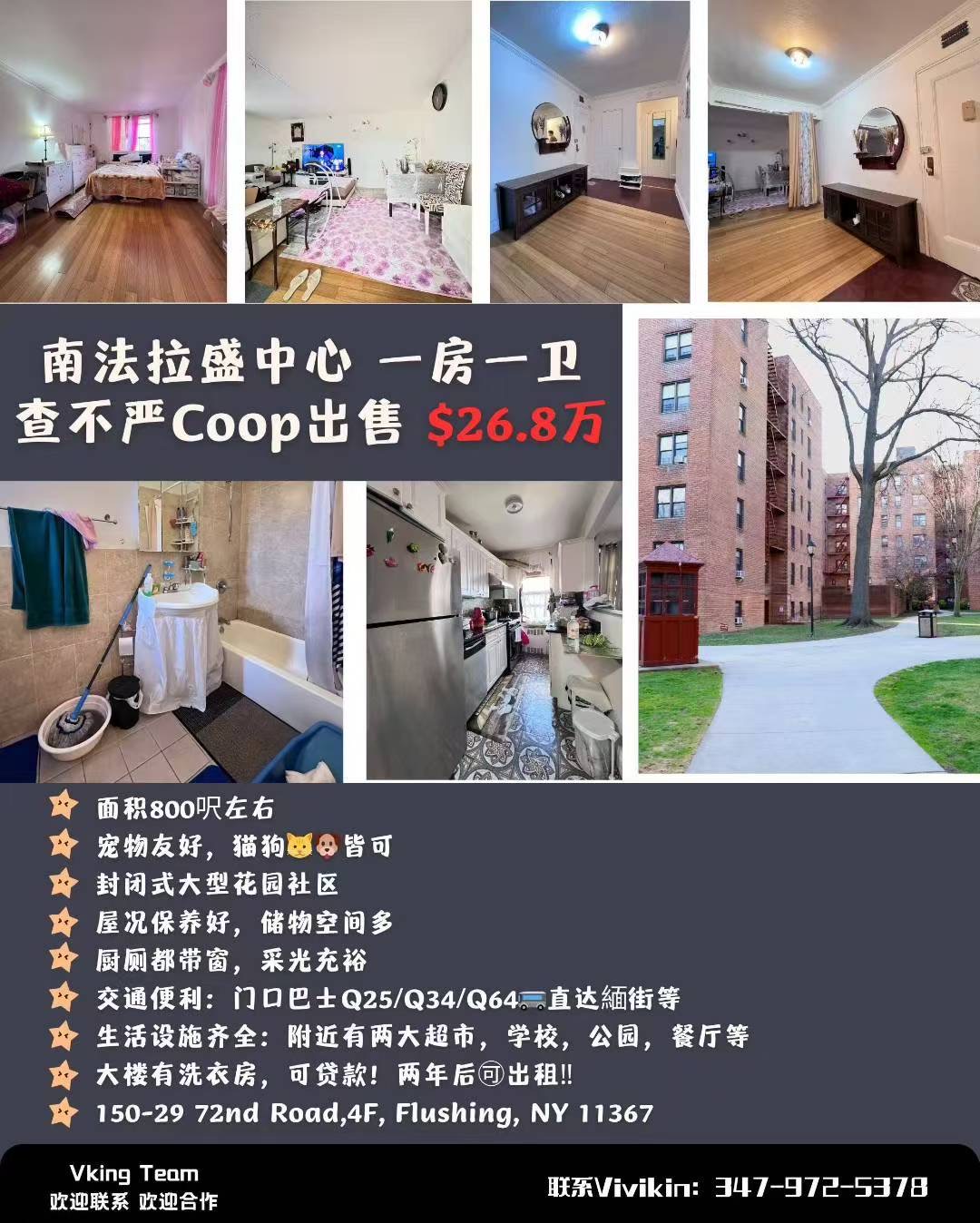 🎉南法拉盛独家代理👏欢迎合作转发🏡南法拉盛中心一房一卫查不严Coop出售$26.8万难得可以买给父母子女的合作公寓!📍150-29 72nd Road,4F, Flushing, NY 11367