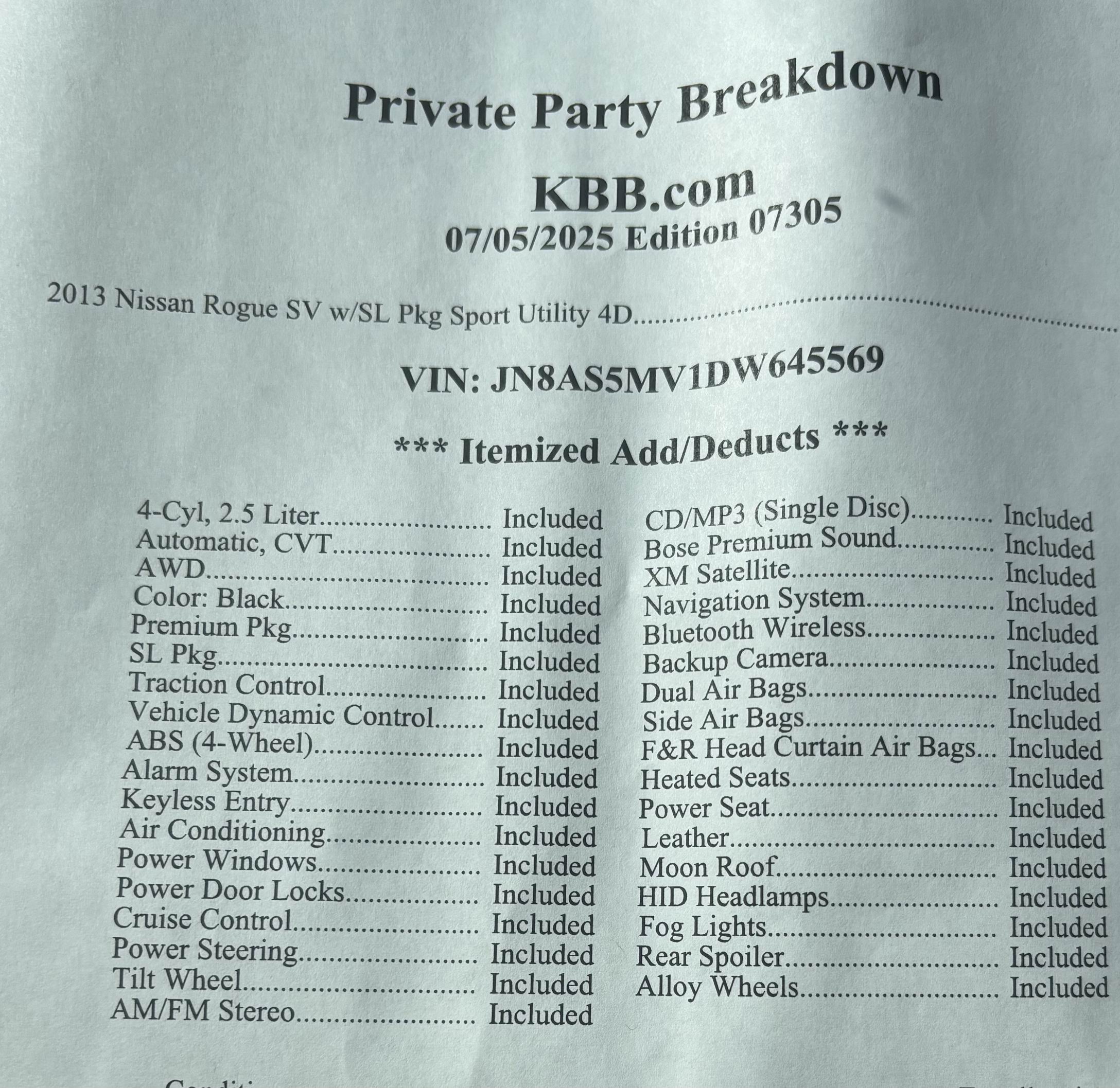 2013 Nissan Rogue SL AWD SUV. 4cyl. Auto., Virtual Bird's-Eye View, Leather, power moonroof,keyless entry, New Tires, Bose audio system with a subwoofer