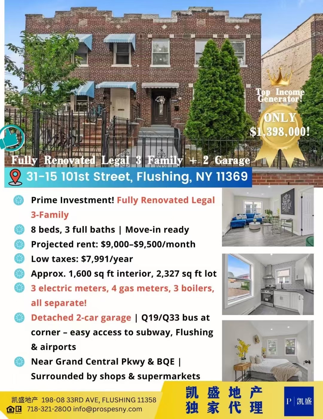 💥新上市|凯盛地产💙独家代理💙🌟【法拉盛投资首选|新装修合法3家庭】🌟💎可立即收租!🔥租金潜力强🔥📍31-15 101st Street, Flushing, NY 11369🌟仅叫 $1,398,000🌟💎 合法3家庭,刚全面翻新,屋况钻石级💎 共8房3全浴,室内约1,600平方英尺,地约2,327平方英尺💎 市场租金约$9,000–$9,500/月,回报率佳💎 地税低,仅$7,991/年,持有成本友好💎 三套独立锅炉,3电表4煤气表,水电气全分户💎 独立双车位车库,停车储物都方便💎 门口即是Q19/Q33巴士站,直达地铁、法拉盛及机场💎 紧邻Grand Central Pkwy与BQE,通勤无忧💎 周边超市、餐馆、生活配套齐全,地段热度高🧾 适合投资或自住,超值不容错过!咨询☎️646-244-0905