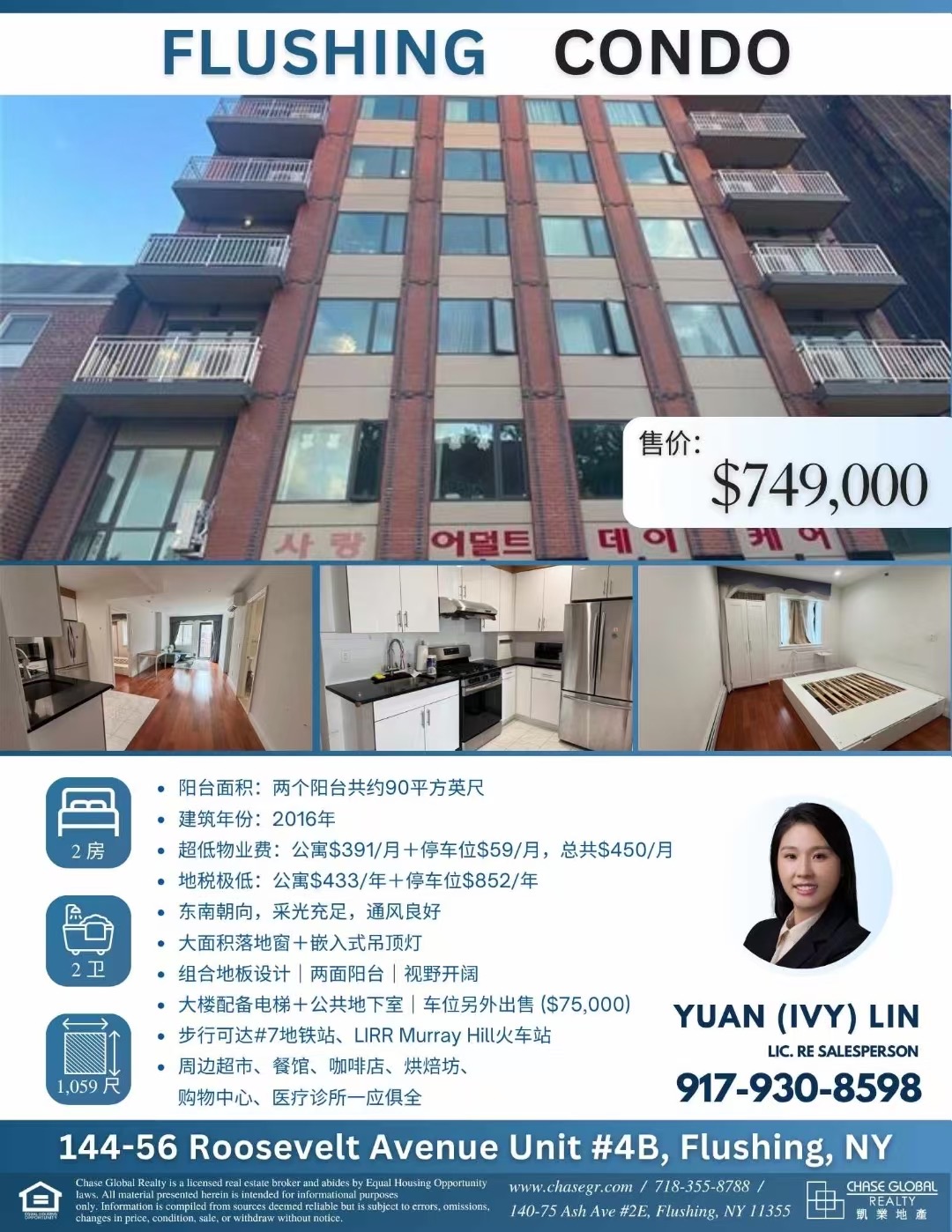 🔥Flushing 法拉盛市中心电梯公寓🔥📍144-56 Roosevelt Ave #4B, Flushing, NY 11354🔸售价:$749,000🔸户型:2卧2卫🔸室内面积:1,059平方英尺(约99平方米)🔸阳台面积:两个阳台共约90平方英尺🔸车位另外出售 ($75,000)🔸建筑年份:2016年🔹超低物业费:公寓$391/月+停车位$59/月,总共$450/月🔹地税极低:公寓$433/年+停车位$852/年🔹东南朝向,采光充足,通风良好🔹大面积落地窗+嵌入式吊顶灯🔹组合地板设计|两面阳台|视野开阔🔹大楼配备电梯+公共地下室🔹步行可达#7地铁站、LIRR Murray Hill火车站