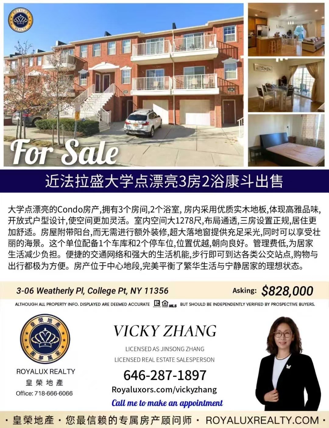 【新上市】皇荣地产独家代理好房源🎖️近法拉盛大学点漂亮3房2浴康斗出售 | 售价$828,000大学点漂亮的Condo房产,拥有3个房间,2个浴室, 房内采用优质实木地板,体现高雅品味,开放式户型设计,使空间更加灵活。室内空间大1278尺,布局通透,三房设置正规,居住更加舒适。房屋附带阳台,而无需进行额外装修,超大落地窗提供充足采光,同时可以享受壮丽的海景。大楼配备停车位,位置优越,朝向良好。管理费低,为居家生活减少负担。便捷的交通网络和强大的生活机能,步行即可到达各类公交站点,购物与出行都极为方便。房产位于中心地段,完美平衡了繁华生活与宁静居家的理想状态。欢迎合作与转发🌹📍地址:3-06 Weatherly Pl, College Pt, NY 11356📲约看请联系负责经纪: