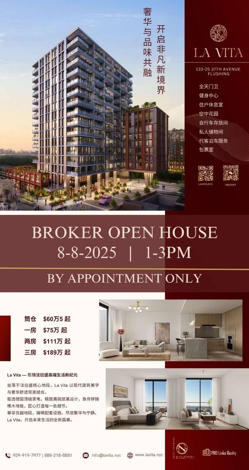 🎉 法拉盛 La Vita 豪华公寓闪耀上市! La Vita Broker Open House 📅 本周五 1:00PM - 3:00PM (仅限预约参观) 📞 预约热线:929-919-7977✨ 样板间现已开放,欢迎带客人提前踩点! 💰 买方经纪享 3% 高额佣金 🔥 八月限时特价,欢迎到现场咨询详情 💳 付款方式灵活,支持人民币付款 🛂 项目还提供 EB-5 投资移民名额,机会有限,速来了解!📍 项目位于法拉盛核心地段,定义高端生活新标杆!户型价格: 📍筒仓公寓:$605,000 起 📍一房一厅:$760,000 起 📍 两房两卫:$1,110,000 起 📍 三房两卫:$1,890,000 起 (已售罄)🏡 顶级户内配置: 德国 Bosch & Gaggenau 高端家电|鱼骨纹橡木地板|挑高天花板|隔音落地大窗|室内洗衣烘干机🎯 尊享配套设施: 空中花园|健身中心|住户专属休息室|宾客代客泊车 |儿童游乐室 | 储物柜📍 La Vita 展示中心地址: 133-25 37th Ave, Flushing, NY 11354