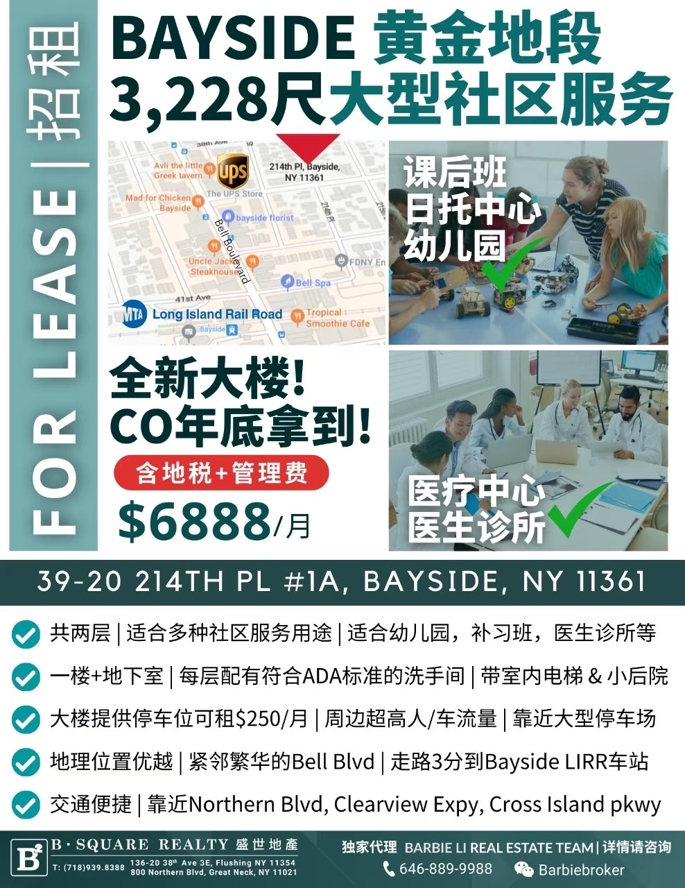 - 紧邻繁华Bell Blvd,步行3分钟到Bayside LIRR车站