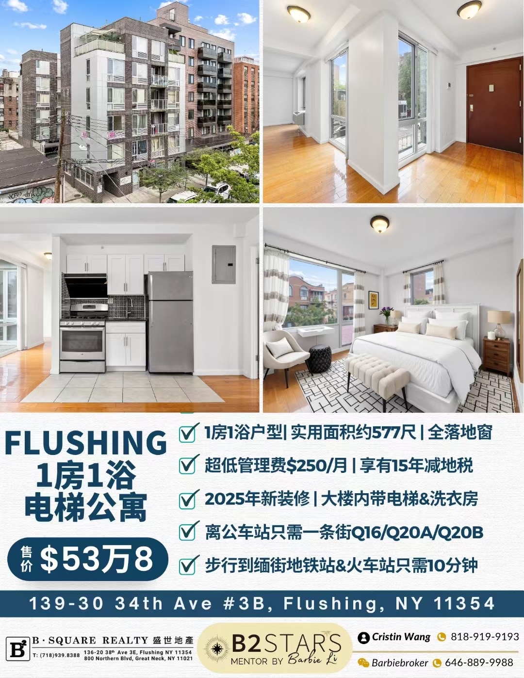 🚇 近Main Street地铁站 & LIRR|通勤曼哈顿方便🚶♀️ 出门一条街多个巴士站(Q16 / Q20A / Q20B)🚇 10分钟直达缅街7号线地铁站 & LIRR🍱 周边生活方便|步行可达H Mart超市、美食广场、餐厅、商店💰 售价53万8📍139-30 34th Ave #3B, Flushing, NY 11354⭐盛世地产 独家代理 🙌🏻欢迎合作☎Cristin #818-919-9193 #B2STARS