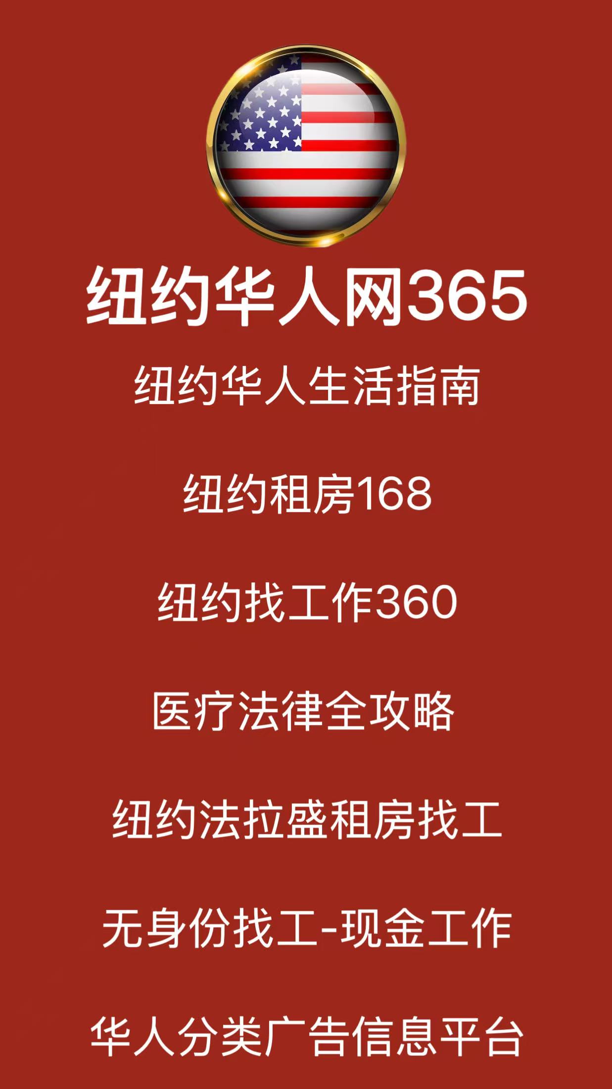 2025纽约华人生活全攻略:租房、找工、医疗、法律一站式指南。最全纽约华人生活指南来啦!2025最新纽约租房168、找工作360、无身份工、法拉盛诊所、移民办证、华人律师信息一网打尽,提升纽约生活效率,就上华人网365!还在发愁纽约租房、找工、办证、看医生?这一篇全攻略解决你95%的生活难题!2025最全华人生活资源+免费发布信息平台,就上纽约华人网365,立即收藏!