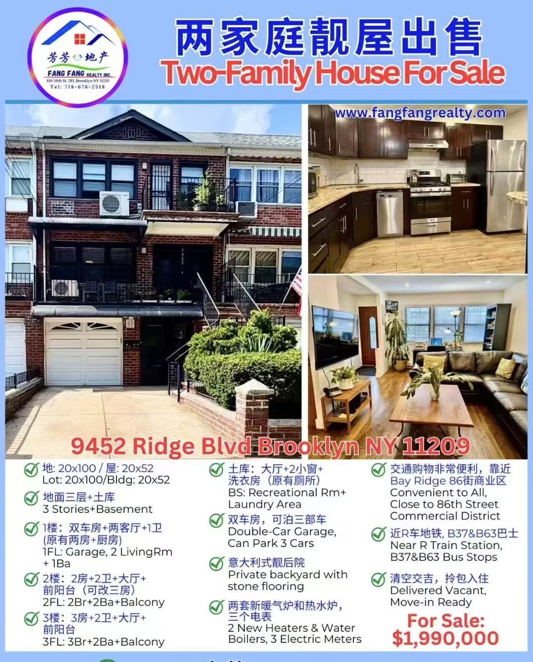🎉🎉Bay Ridge 两家庭靓屋出售🎉🎉👍 纽约布碌伦 9452 Ridge Blvd 富人区两家庭靓砖屋出售;全栋楼新靓装修,实木地板,独特的厨房设计和云石枱面,每层主人房有Walk in 衣柜…..