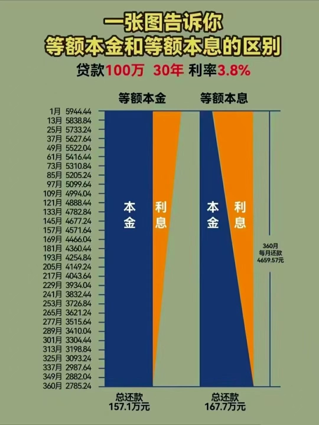 • 等额本金:每月还款金额逐月减少,前期还款多,利息总额少。