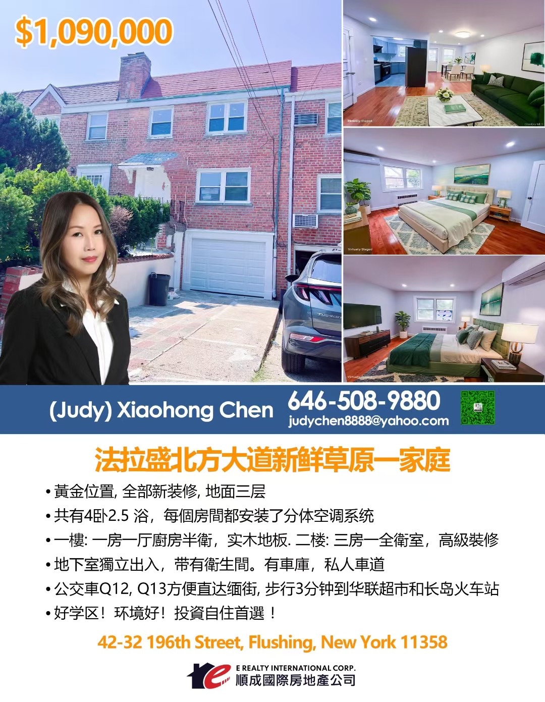 最新上市!出售法拉盛北方大道新鮮草原!1️⃣黃金位置!全部新装修一家庭!地面三层2️⃣一樓一房一厅廚房半衛,实木地板3️⃣二楼三房一全衛室,高級裝修4️⃣地下室獨立出入,車庫,車道,可分租当一房一廳,目前已有衛生間。5️⃣公交車🚌方便Q12、Q13直达缅街, 步行3分钟到华联超市和长岛火车站🚉,6️⃣共有4卧2.5 浴,每個房間都安装了分体空调系统,投資自住首選 !好学区!环境好!看房方便!仅售$109 萬!歡迎合作转發