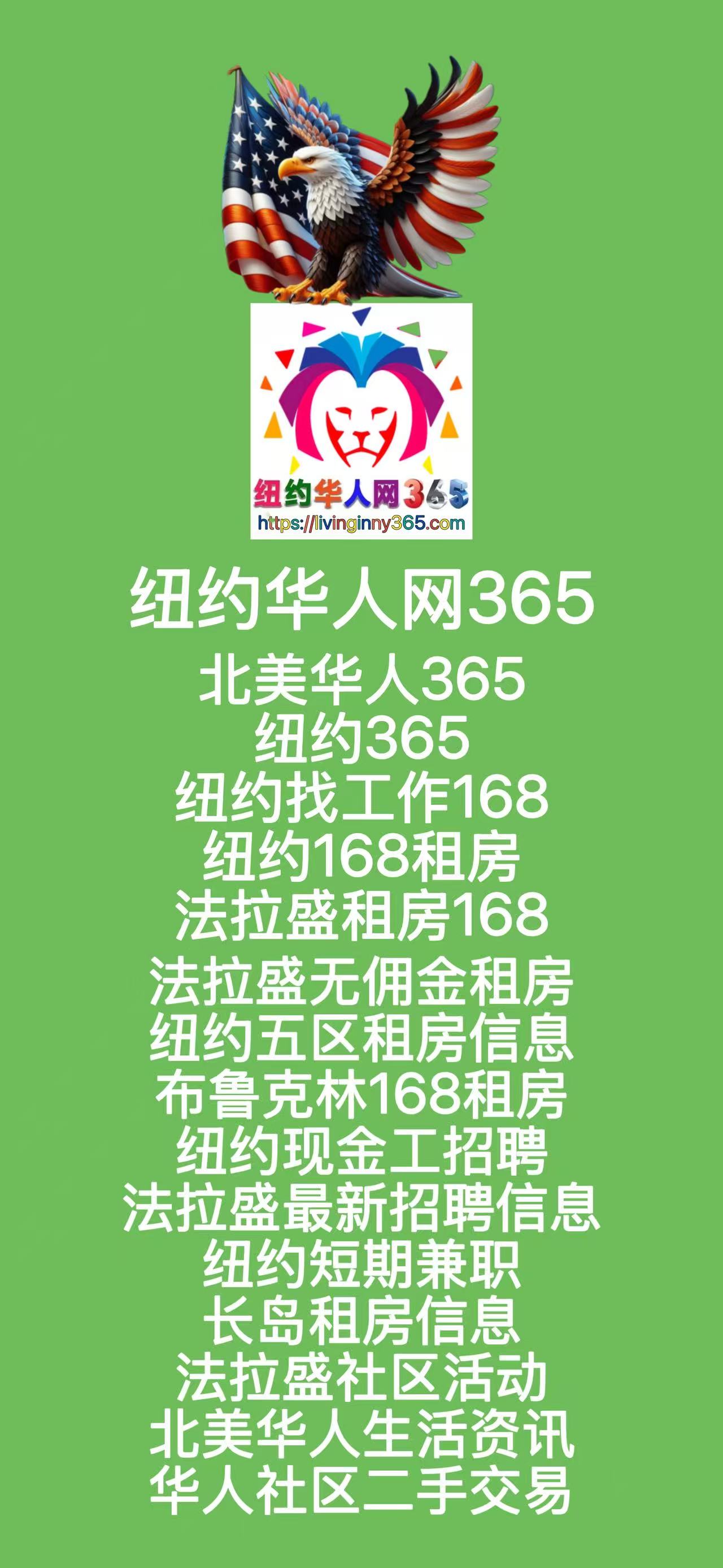 纽约365-北美华人365:纽约找工作168与纽约租房168全攻略。全面解析北美华人生活资讯:纽约找工作168、纽约168租房、法拉盛租房168、社区服务、医疗、保险及二手交易一站式指南。一站式纽约华人生活平台:北美华人365、纽约找工作168、纽约168租房、法拉盛租房168、医疗、保险、搬家与社区服务全解析。