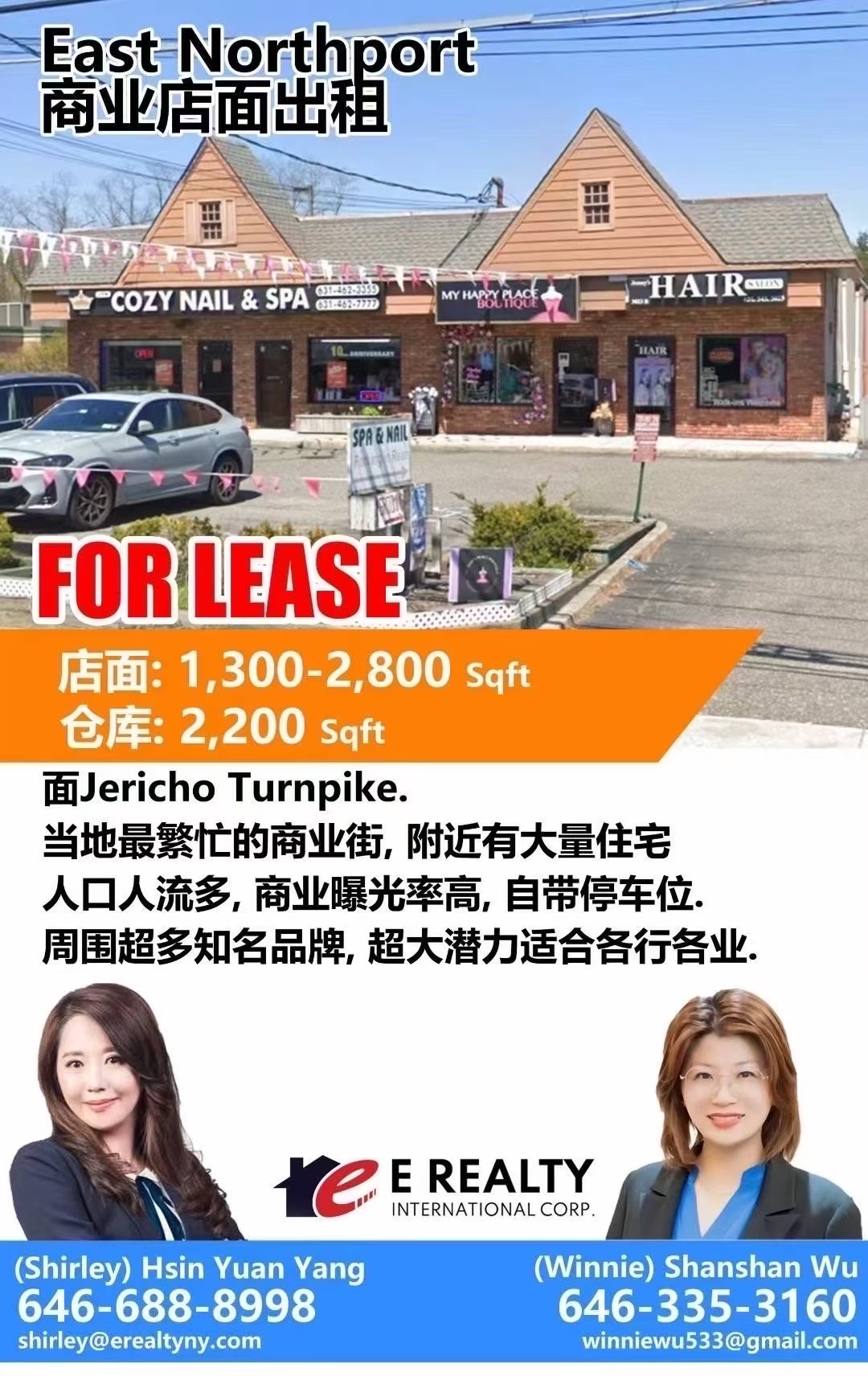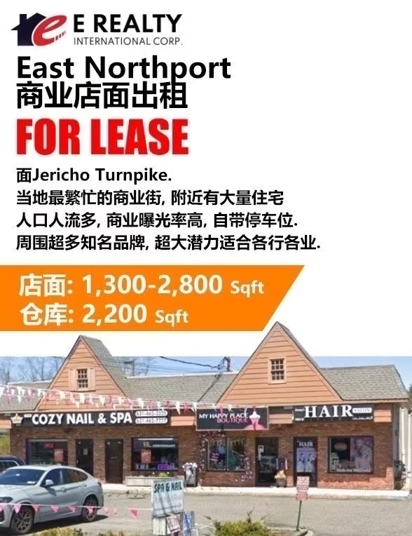 East Northport 商业店面出租面Jericho Turnpike,当地最繁忙的商业街, 附近有大量住宅,人口人流多, 商业曝光率高, 自带停车位. 周围超多知名品牌, 超大潜力适合各行各业.