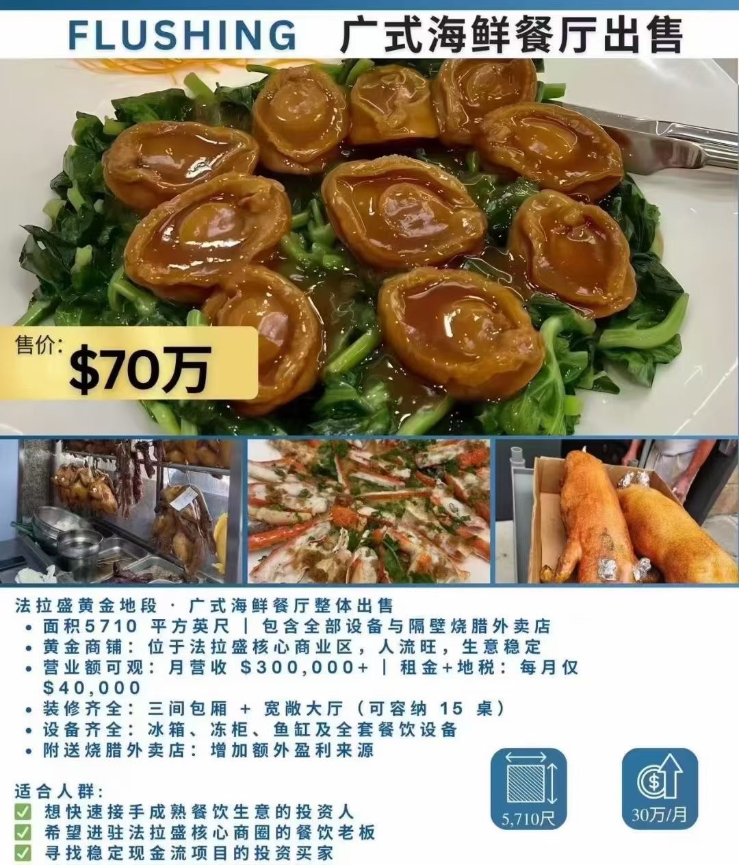 🦞 法拉盛黄金地段 · 广式海鲜餐厅整体出售面积5710 平方英尺