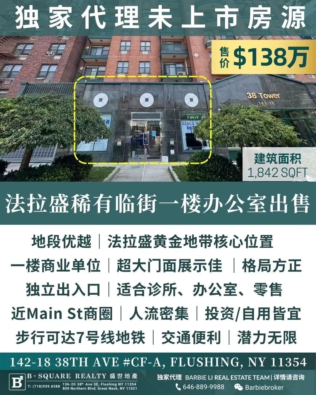 📢🔥法拉盛稀有临街一楼办公室出售🔥未上市独家房源!📍142-18 38th Ave #CF-A, Flushing, NY 11354🏢 建筑面积1,842尺 | 一楼商业单位🚪 超大门面展示性强 | 独立出入口