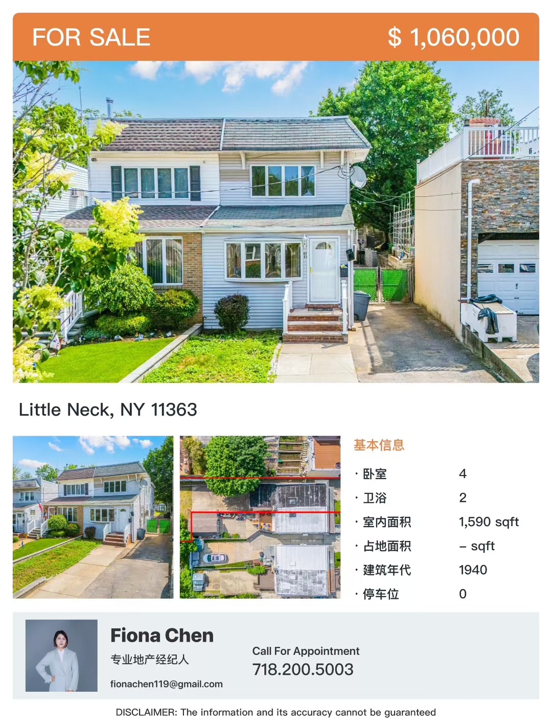 🎈REMAX 1st Choice小颈 新代理Little Neck 新上市单边一家庭住宅出售,4房2浴,适合三代同堂, 领包即可入住.