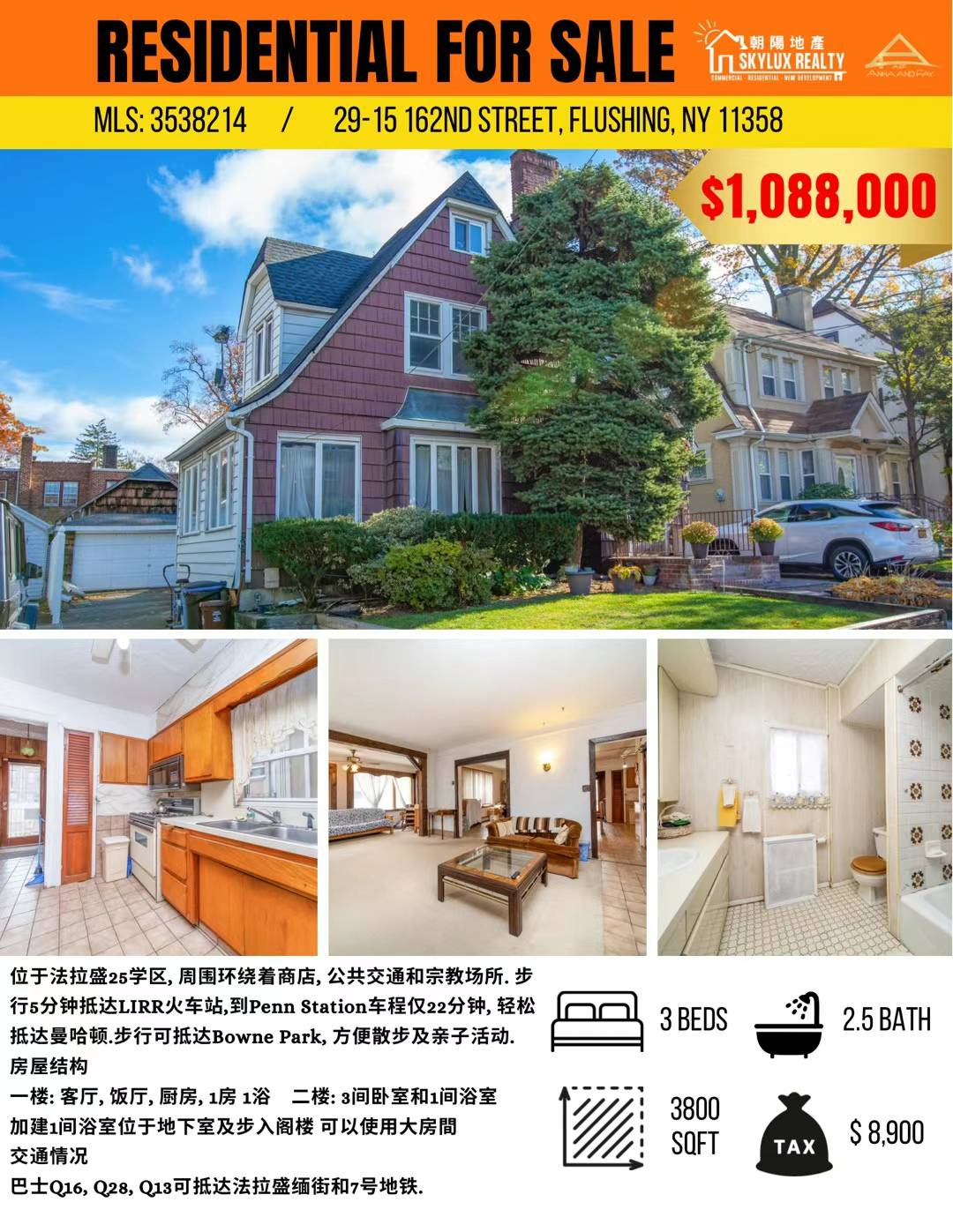 位于法拉盛25学区, 周围环绕着商店, 公共交通和宗教场所. LIRR仅有5个街区之遥,到Penn Station车程仅22分钟, 轻松抵达曼哈顿.步行可抵达Bowne Park, 方便散步及亲子活动.