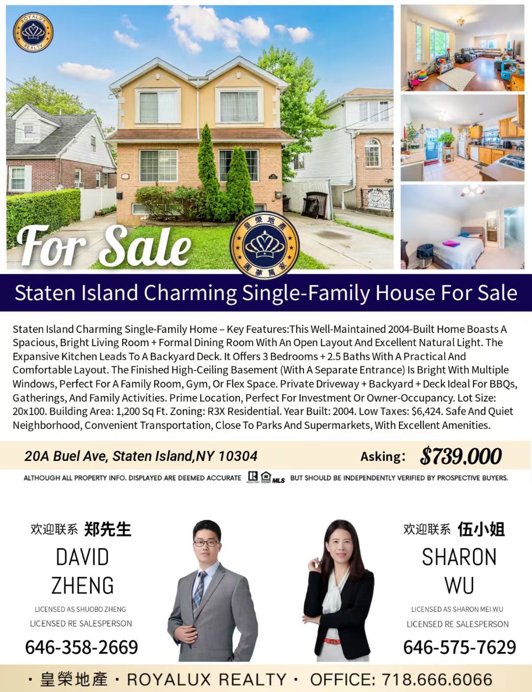 【史丹顿岛皇荣独家代理 】Open house 欢迎👏各位精英莅临.Staten Island 年轻单边漂亮一家庭✨房屋亮点 Highlights:✅ 2004 年建 房屋维护极佳✅ 宽敞明亮客厅 + 正式餐厅,格局开阔采光好✅ 宽敞式厨房可通向后院Deck ✅ 3间卧室 + 2.5浴室🛀|空间合理舒适实用✅ 完成式高顶地下室(带独立出入口)多窗明亮,可作家庭娱乐室、健身房、多功能空间✅ 独立车道+ 后院+Deck 适合烧烤、聚会与亲子活动✅ 地理位置优越,投资自住首选📐 土地面积:20x 100🏠 建筑面积:1200尺 📏 分区:R3 X 住宅区📆 建造年份:2004💵 低地税:$6424🏘️社区安全宁静|交通便利|近公园 超市| 生活机能强🤝🏻欢迎各位买家约看及各位精英合作 📍地址:20A Buel Ave, Staten Island,NY 10304