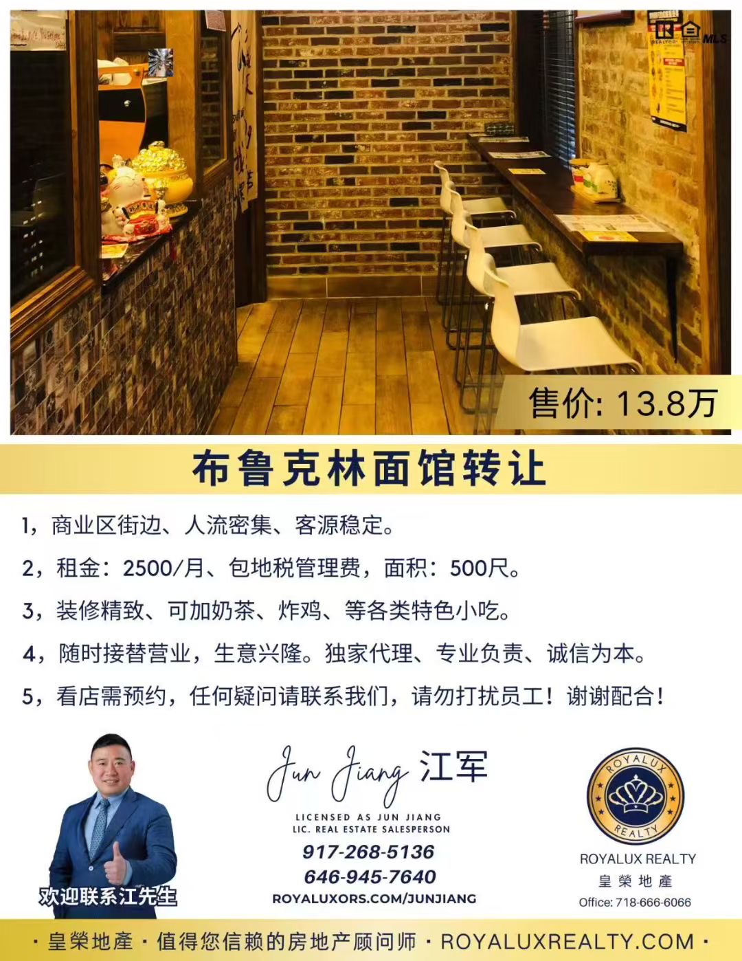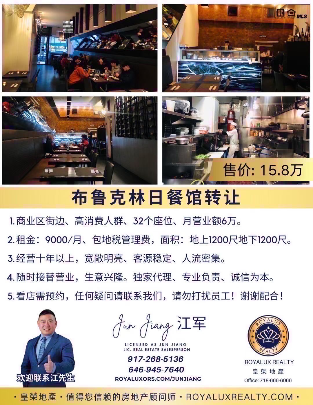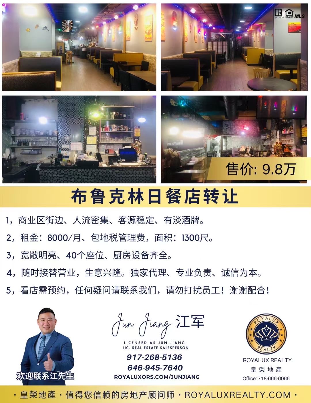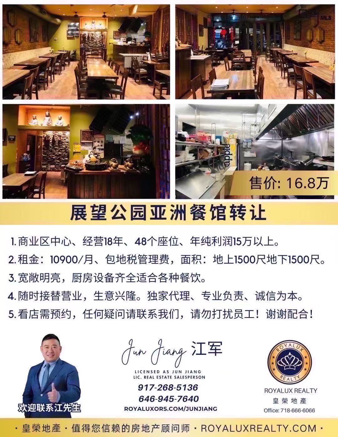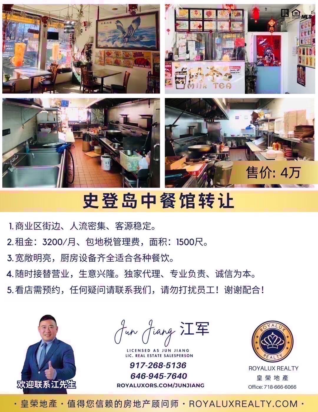 纽约生意转让出售🥇布鲁克林和史登岛各类餐馆🍲转让🗽纽约房屋买卖找江軍☎️9172685136用良知做事成就幸福人生